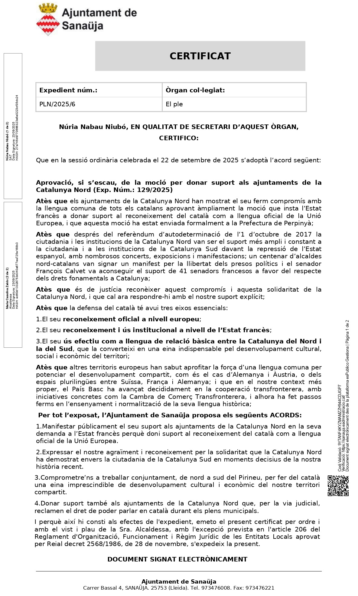 Le 22 septembre 2025, la mairie de Sanaüja, située dans la comarca de l’Alta Segarra, a approuvé la motion présentée par les Angelets de la Terra en soutien aux municipalités de la Catalogne Nord.