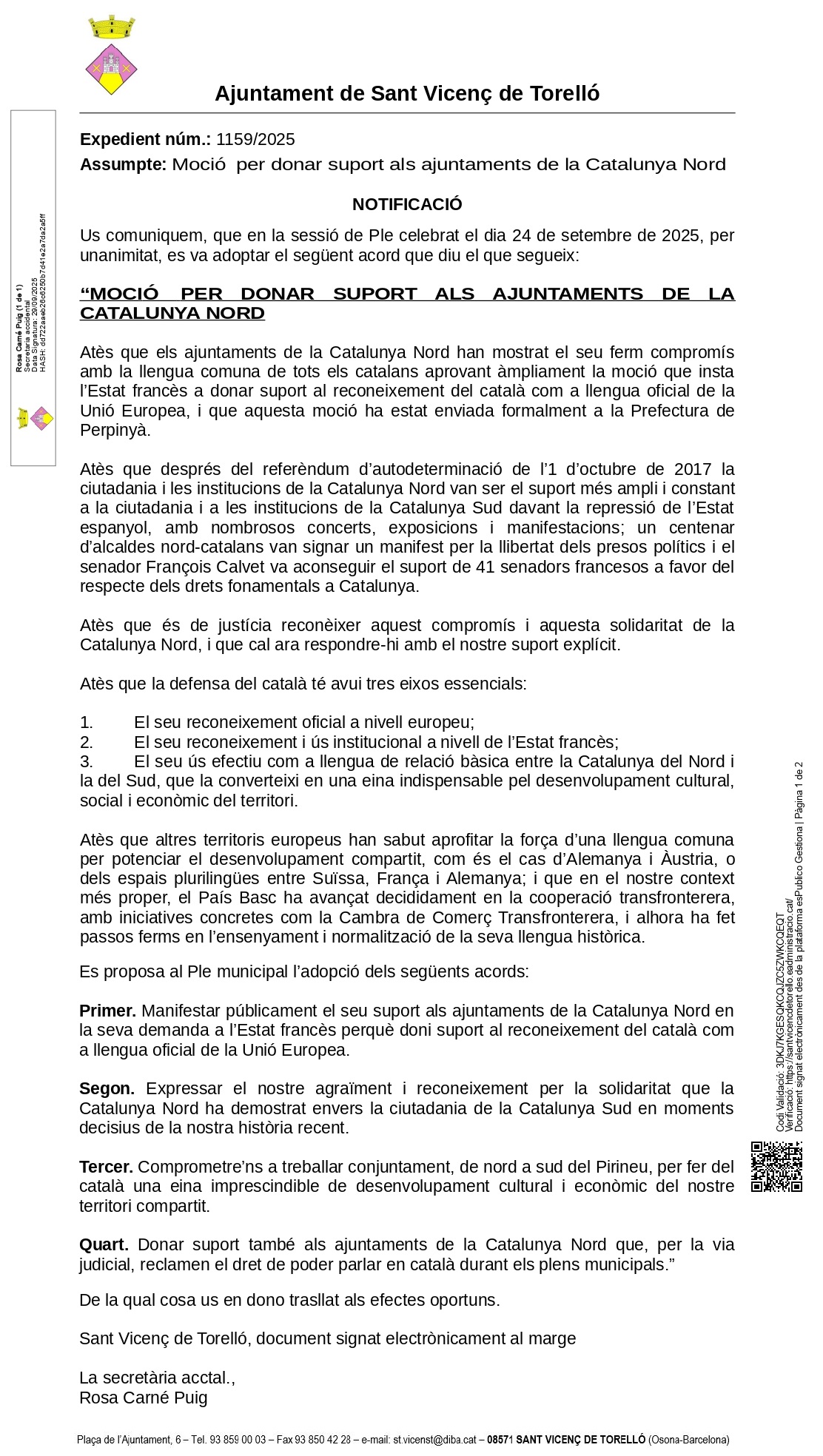 Le 24 septembre 2025, la municipalité de Sant Vicenç de Torelló, située dans la comarque d’Osona, a adopté la motion présentée par les Angelets de la Terra en soutien aux communes de Catalogne Nord.