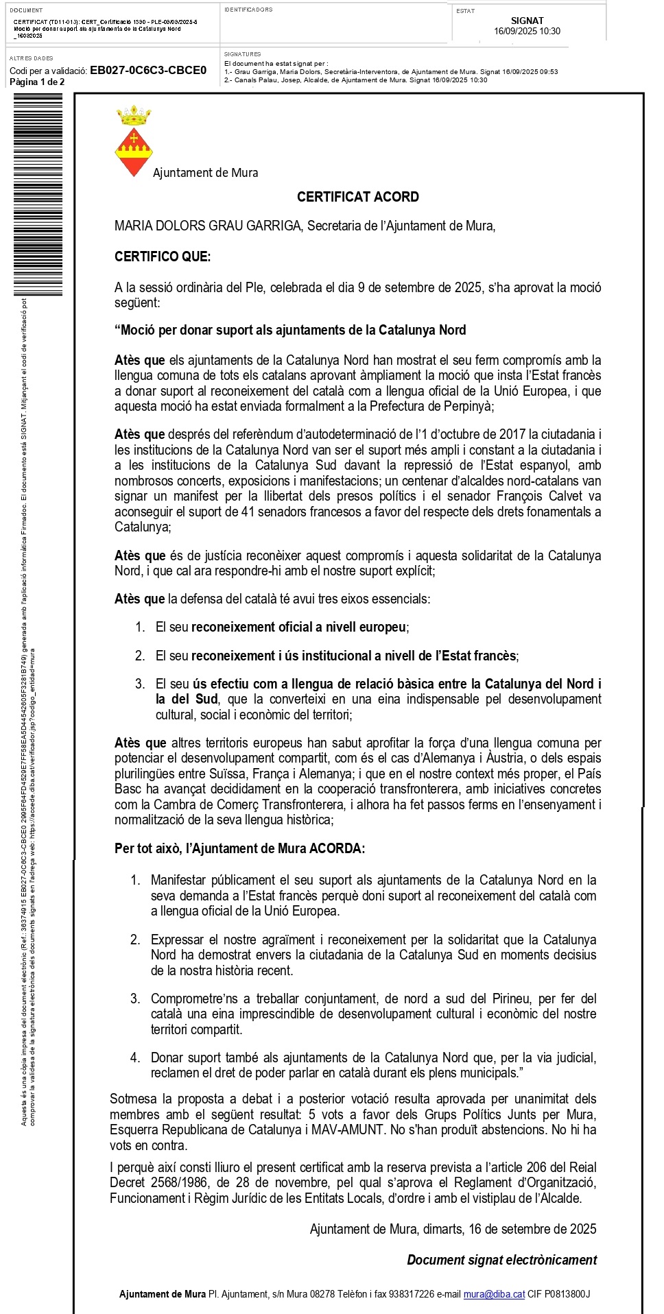 Le 9 septembre 2025, la municipalité de Mura, située dans la comarque du Bages, a adopté la motion présentée par les Angelets de la Terra en soutien aux communes de Catalogne Nord.