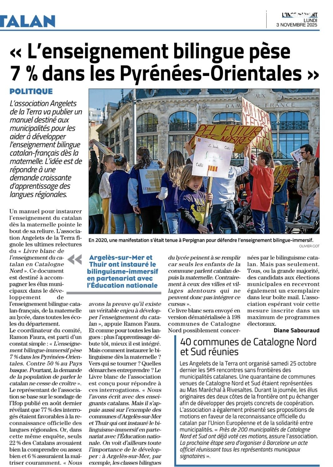 L’Indépendant, seul journal de Catalogne Nord, a publié le lundi 3 novembre une demi-page en deuxième page consacrée au Livre blanc de l’enseignement du catalan en Catalogne Nord. Et, comme à chaque fois que l’association Els Angelets de la Terra mène une action en faveur du catalan, les attaques et critiques — souvent en dessous de la ceinture — du « microcosme catalaniste » ne tardent pas à pleuvoir.