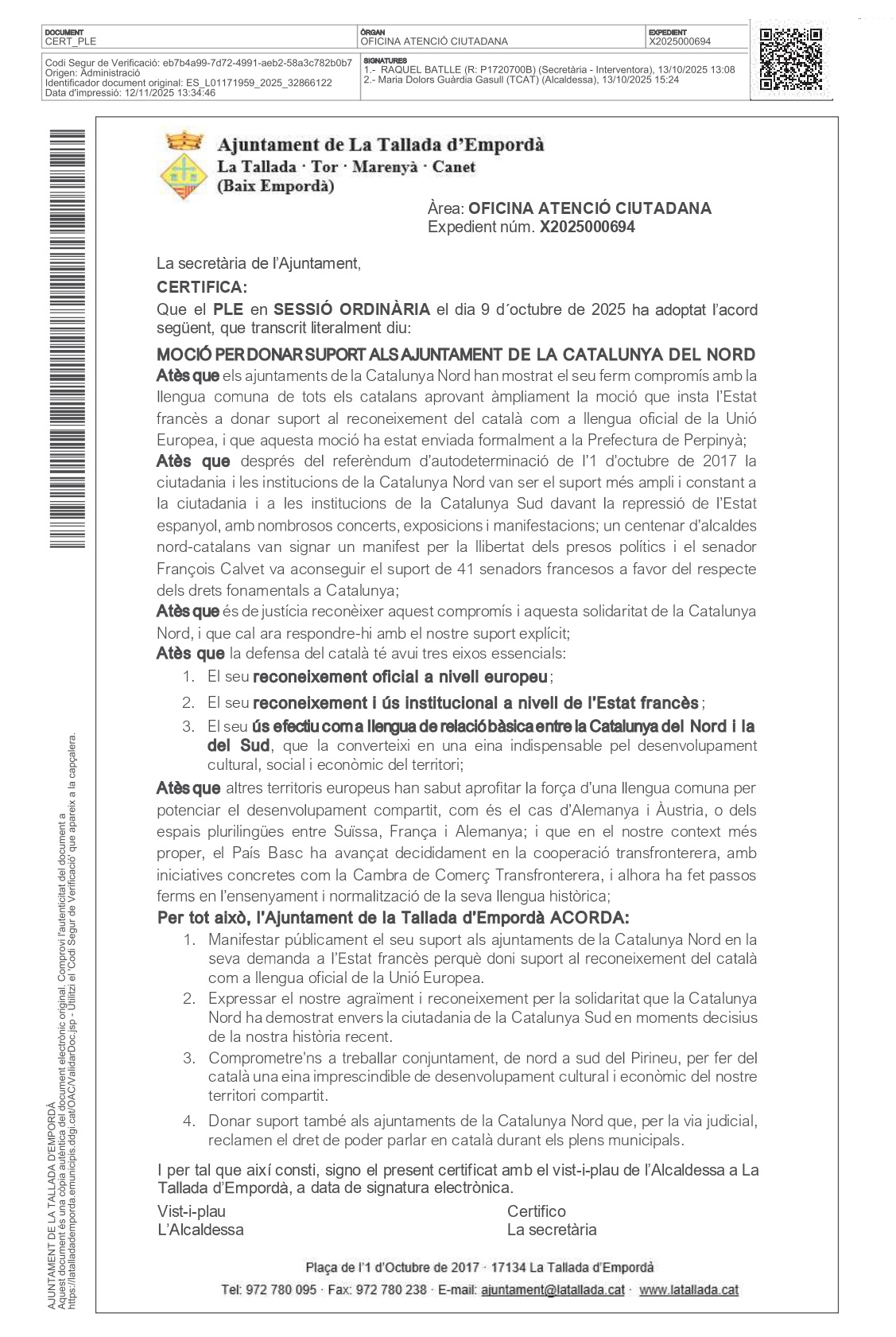 Le 13 octobre 2025, La Tallada d’Empordà a approuvé la motion proposée par les Angelets de la Terra, visant à défendre la langue catalane commune et à renforcer les liens entre la Catalogne Nord et la Catalogne Sud.