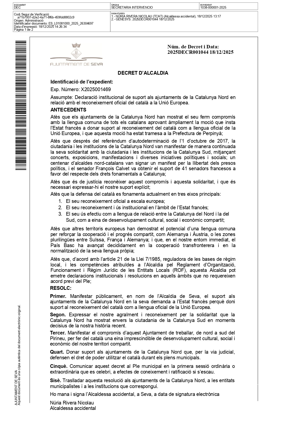 Le 18 décembre 2025, la mairie de Seva a approuvé par arrêté municipal la motion présentée par les Angelets de la Terra, visant à renforcer la défense de la langue catalane commune et à consolider les liens institutionnels entre la Catalogne Nord et la Catalogne Sud.
