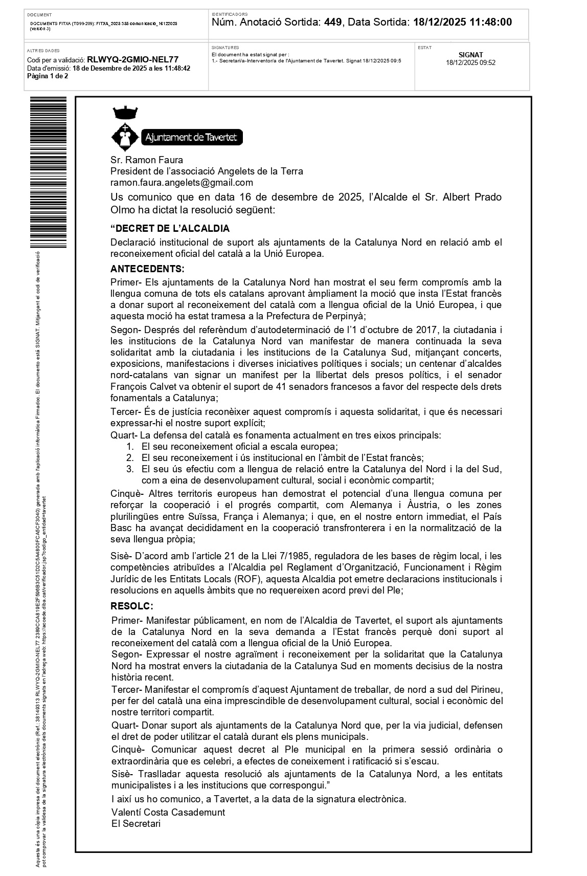 Le 16 décembre 2025, la mairie de Tavertet a approuvé par arrêté municipal la motion présentée par les Angelets de la Terra, visant à renforcer la défense de la langue catalane commune et les liens institutionnels entre la Catalogne Nord et la Catalogne Sud.