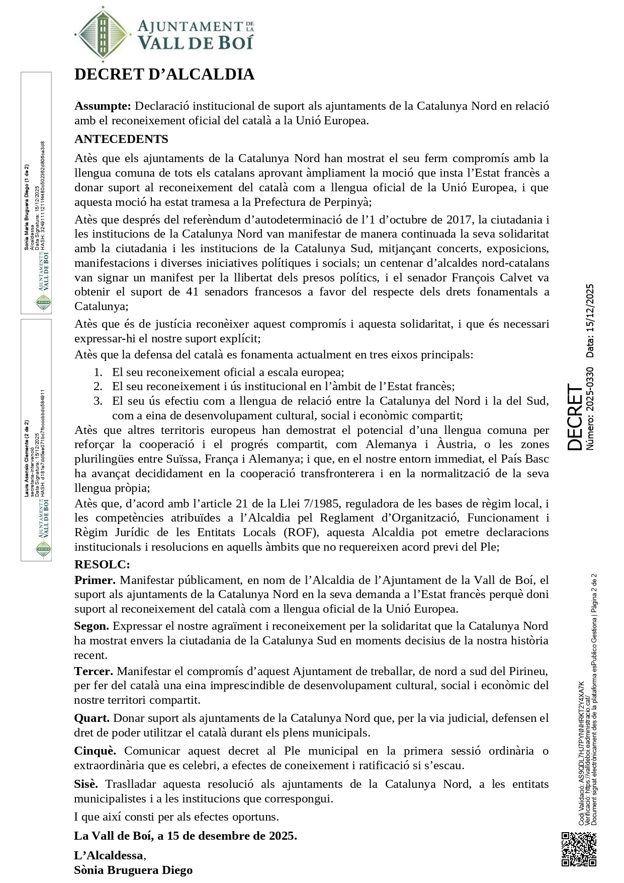 Le 15 décembre 2025, la mairie de la Vall de Boí a approuvé par arrêté municipal la motion présentée par les Angelets de la Terra, visant à défendre la langue catalane commune et à renforcer les relations institutionnelles entre la Catalogne Nord et la Catalogne Sud.