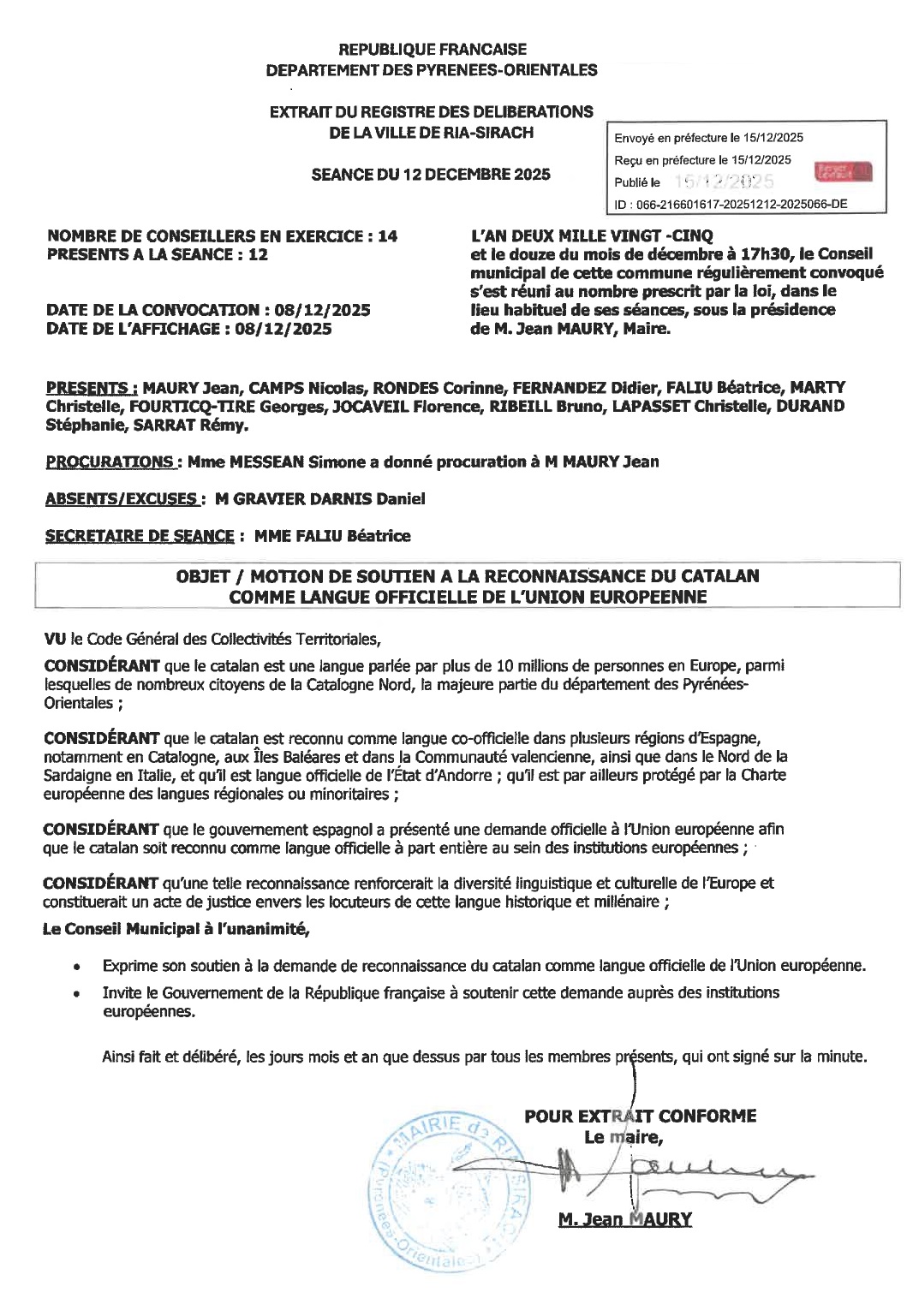 Le 12 décembre 2025, le conseil municipal de Rià i Cirac (Conflent) a adopté à l’unanimité la motion présentée par les Angelets de la Terra en soutien à la reconnaissance du catalan comme langue officielle de l’Union européenne.