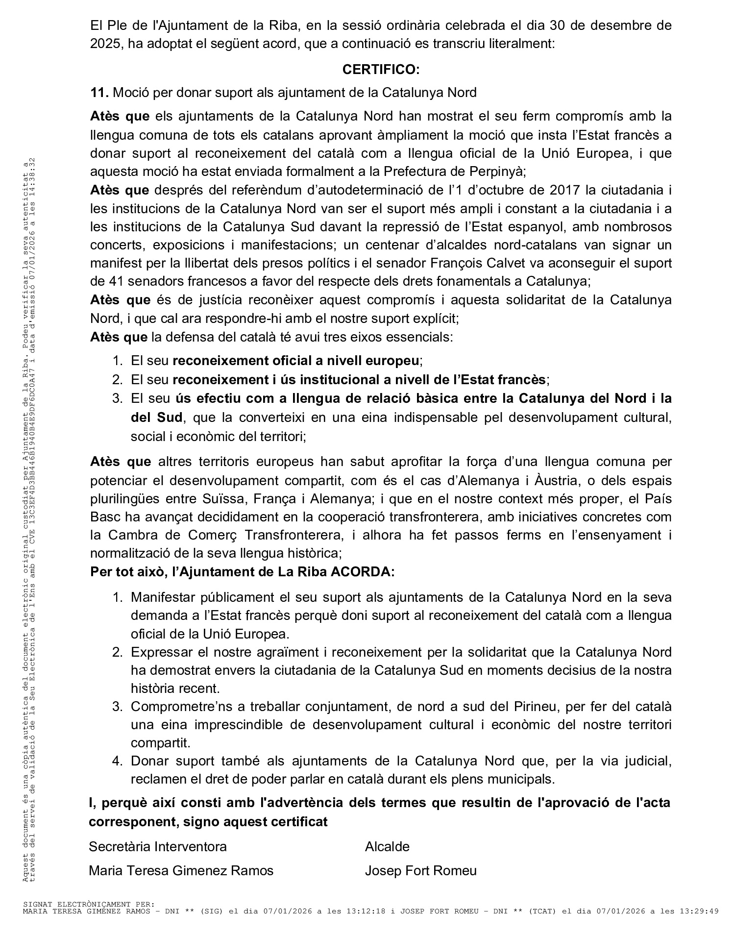 Avec cette approbation, La Riba rejoint l’ensemble des municipalités qui œuvrent pour la défense de la langue catalane commune et pour le renforcement des liens entre tous les territoires du pays.