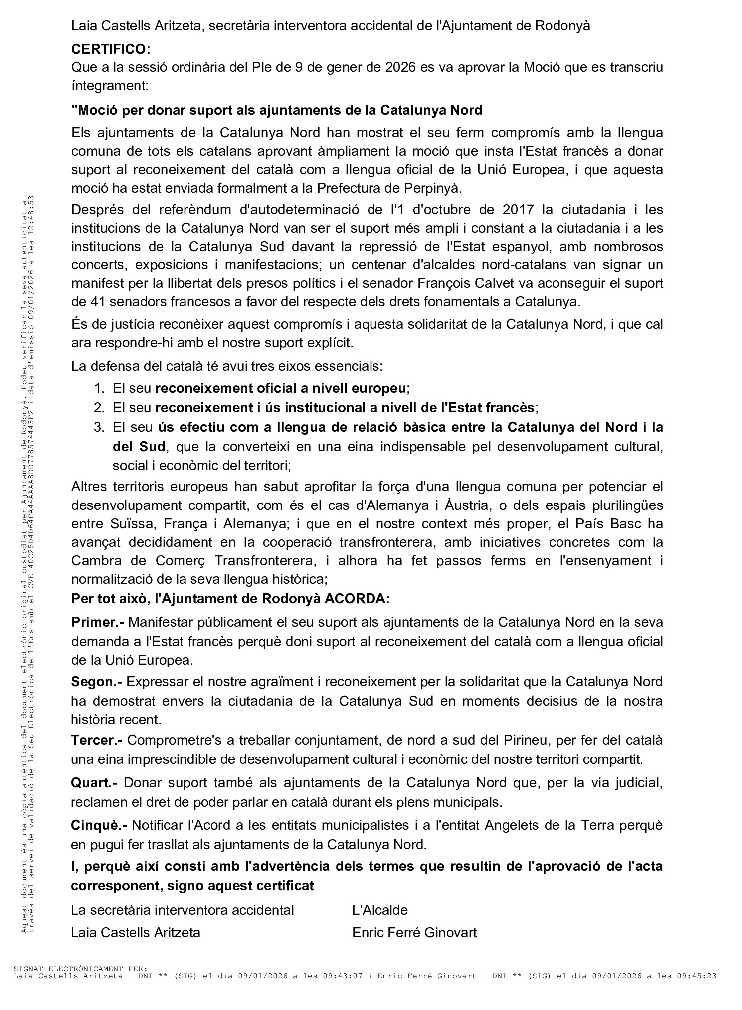 Le 9 janvier 2026, la mairie de Rodonyà a approuvé la motion présentée par les Angelets de la Terra, avec pour objectif de renforcer la défense de la langue catalane commune et de consolider les liens institutionnels entre la Catalogne Nord et la Catalogne Sud.