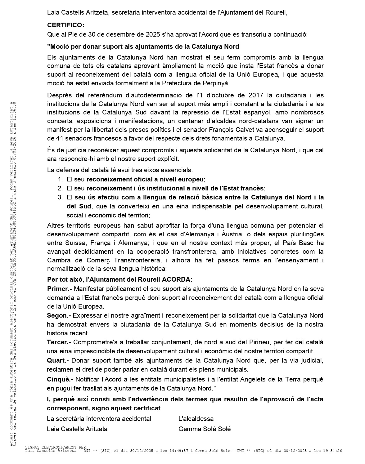 Le 30 décembre 2025, la mairie d’El Rourell a approuvé la motion présentée par les Angelets de la Terra, avec pour objectif de renforcer la défense de la langue catalane commune et de consolider les liens institutionnels entre la Catalogne Nord et la Catalogne Sud.