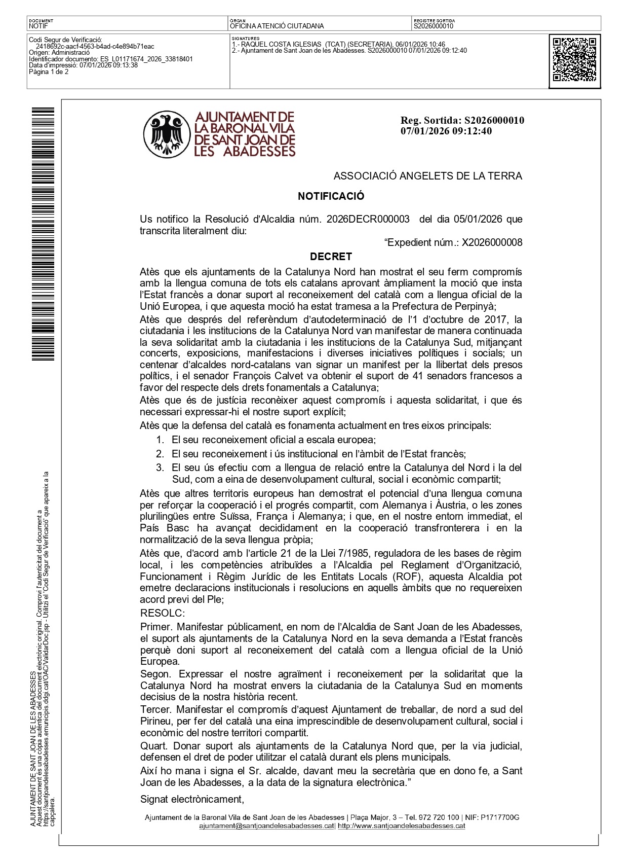 Le 5 janvier 2026, la mairie de Sant Joan de les Abadesses a approuvé la motion présentée par les Angelets de la Terra, avec pour objectif de renforcer la défense de la langue catalane commune et de consolider les liens institutionnels entre la Catalogne Nord et la Catalogne Sud.