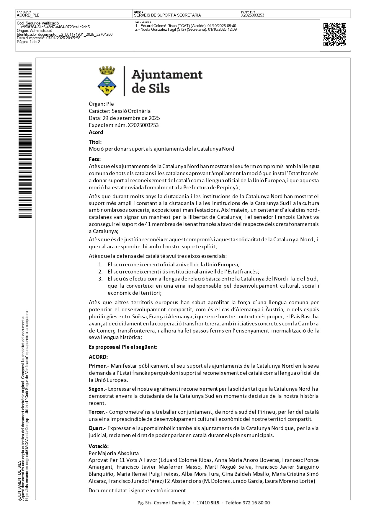 Avec cette approbation, Sils rejoint l’ensemble des municipalités qui œuvrent pour la défense de la langue catalane commune et pour le renforcement des liens entre tous les territoires du pays.