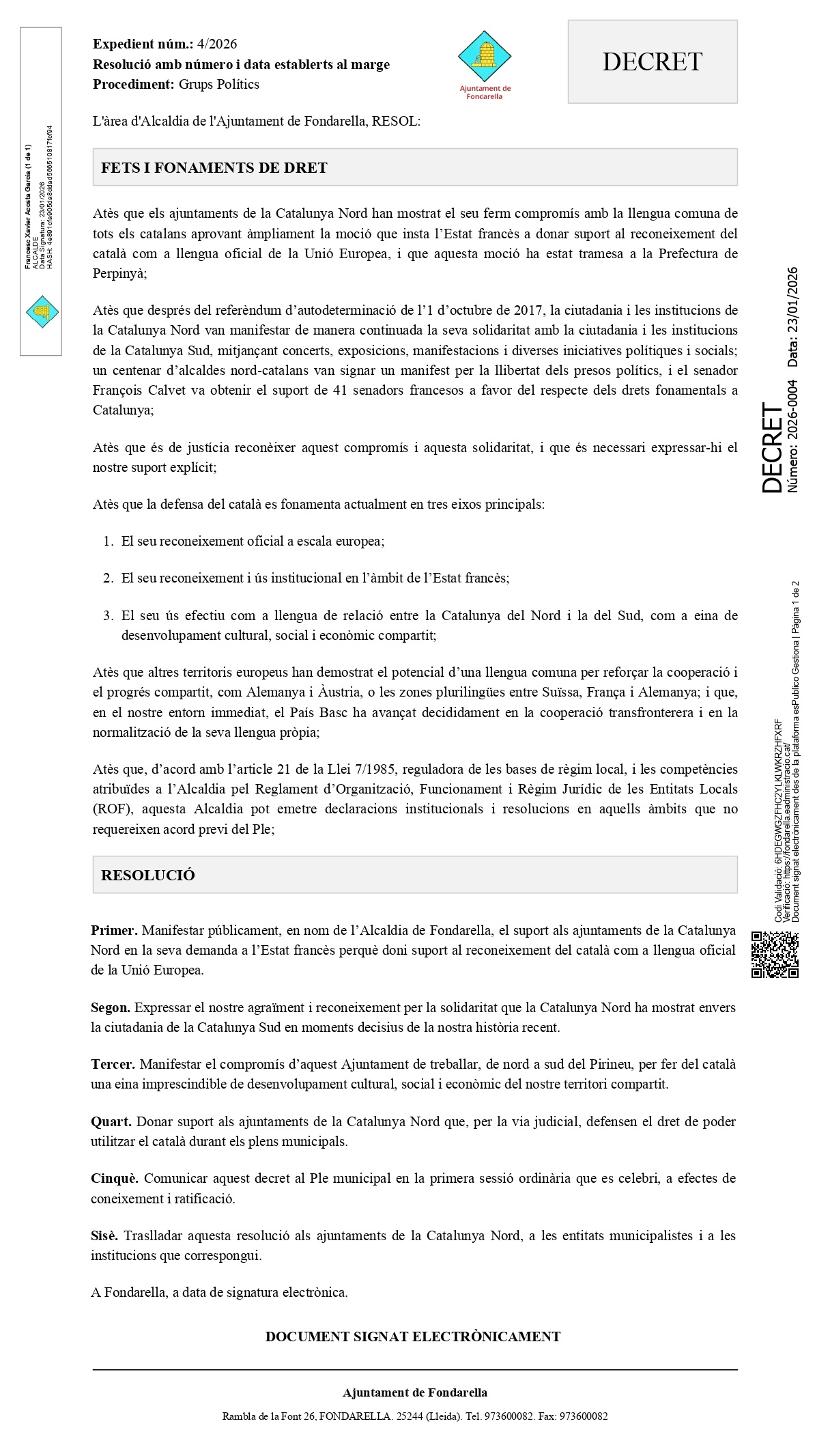 Avec cette approbation, Fondarella rejoint l’ensemble des municipalités qui œuvrent pour la défense de la langue catalane commune et pour le renforcement des liens entre tous les territoires du pays.