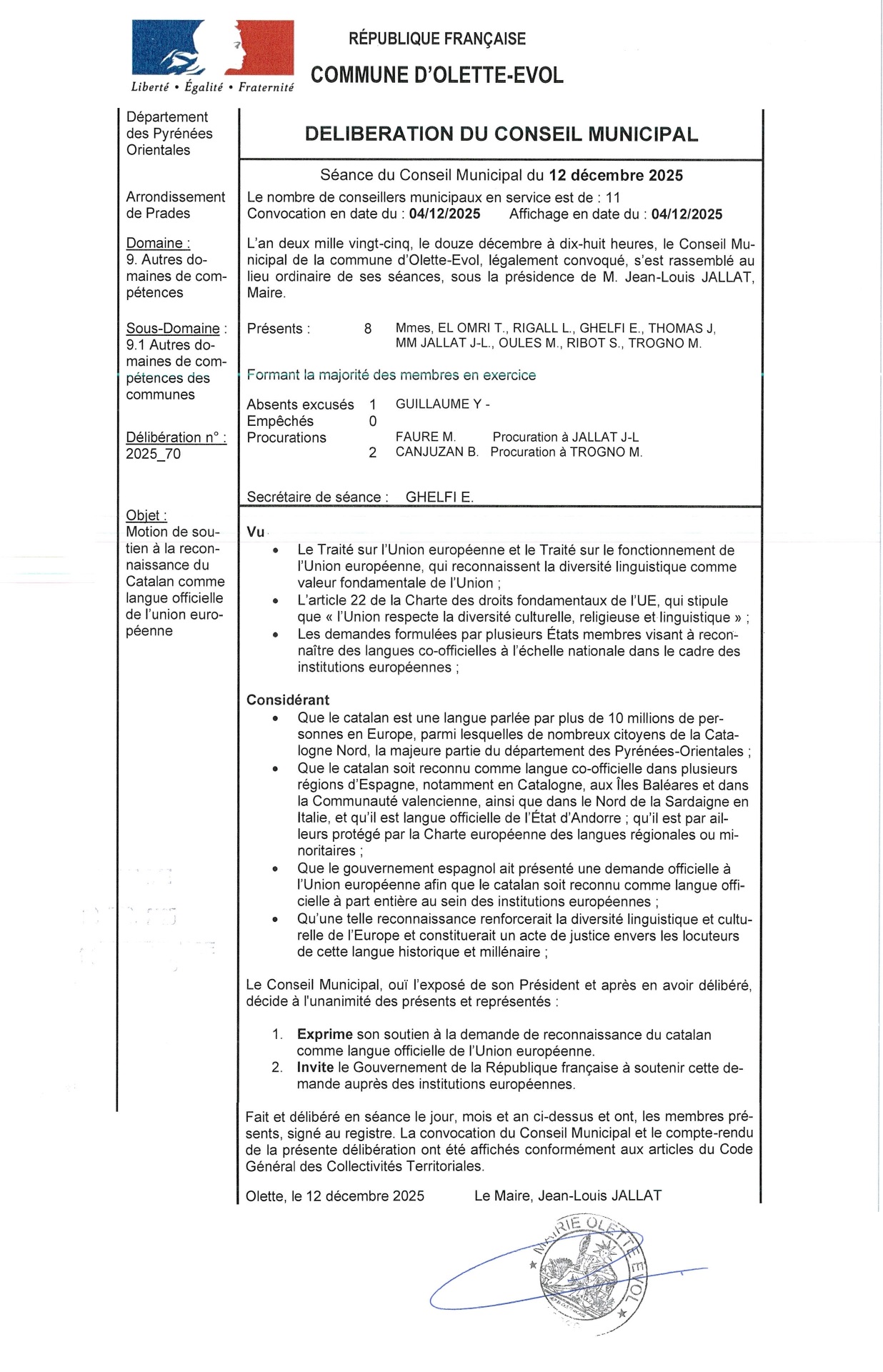 La décision approuvée par la mairie d’Oleta soutient la reconnaissance du catalan comme langue officielle de l’Union européenne. Elle affirme l’engagement de la commune en faveur de la diversité linguistique en France et en Europe, dans le cadre de la campagne des Angelets de la Terra : « Une langue sans frontières ».