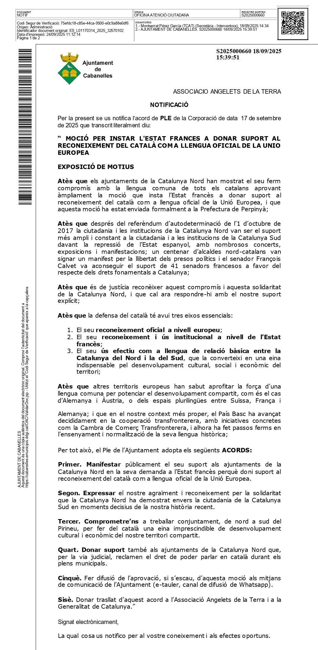 À la fin du mois d’août 2025, les Angelets de la Terra ont proposé aux communes de Catalogne Sud d’adhérer à une motion qui donne continuité et résonance à celle déjà impulsée, avant l’été, avec les communes de Catalogne Nord.