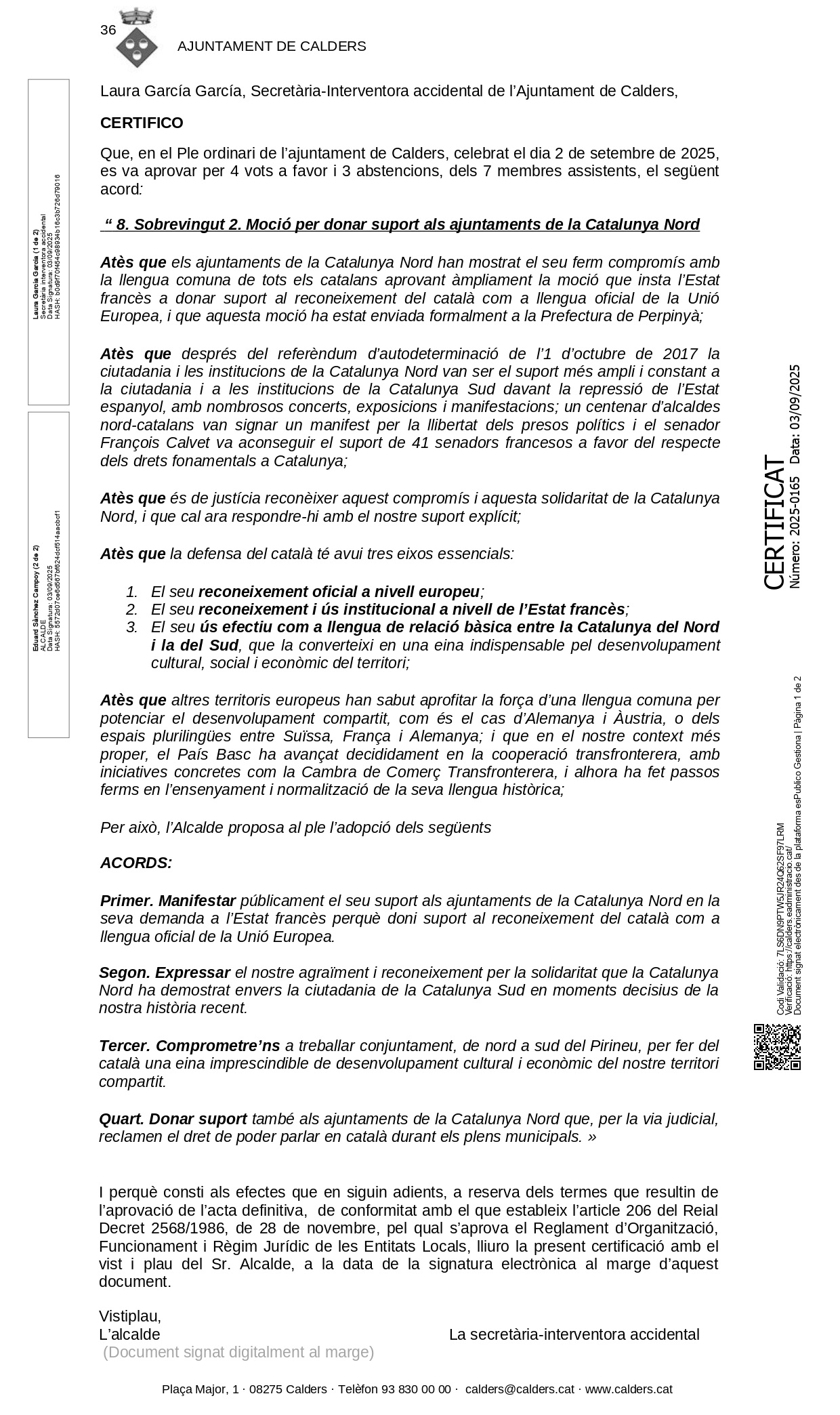 Calders adhère à la motion des Angelets de la Terra en soutien aux municipalités de Catalogne Nord et à la langue commune