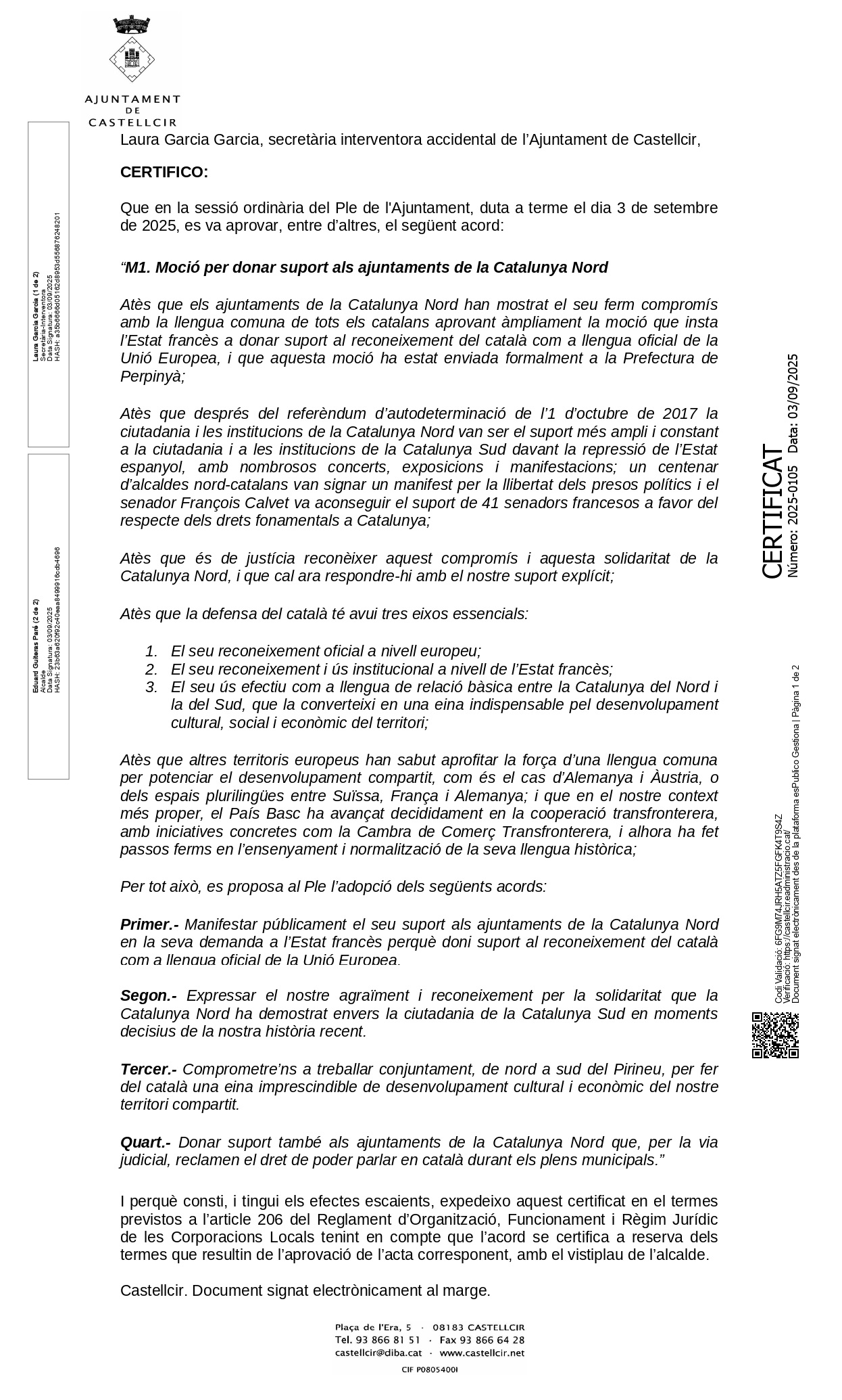 Le 3 septembre 2025, la mairie de Castellcir, commune de la comarca du Vallès Oriental, a voté la motion de soutien aux municipalités de la Catalogne Nord dans leur démarche en faveur de la reconnaissance officielle du catalan au niveau européen.