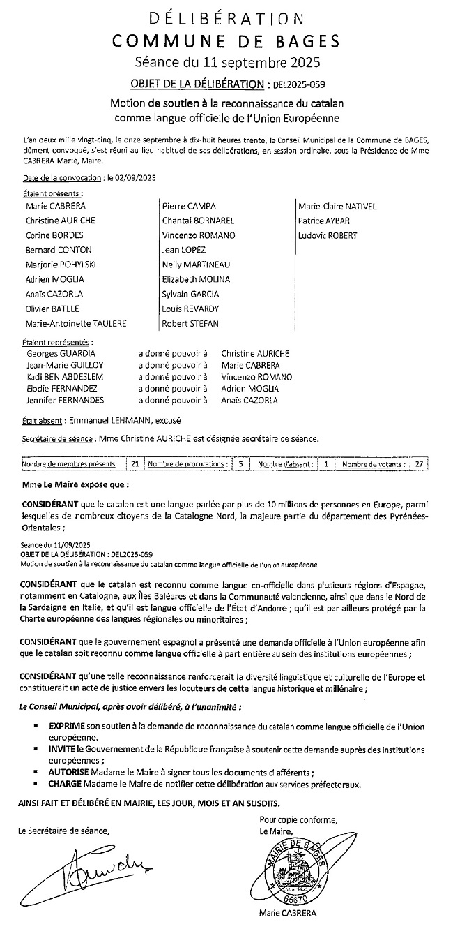 En adoptant cette motion, le conseil municipal de Bages affirme son soutien à cette demande et invite le gouvernement français à appuyer la reconnaissance du catalan au niveau européen.
