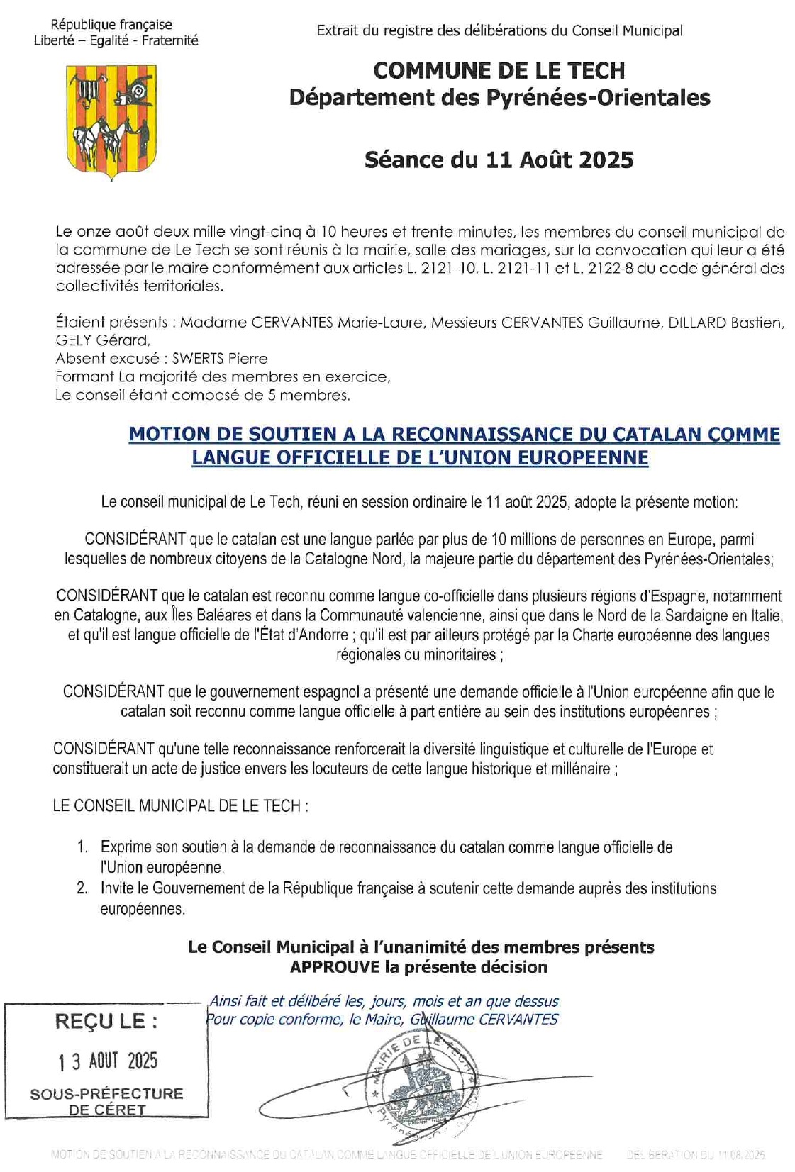Le 11 août 2025, le conseil municipal du Tec (Vallespir) a approuvé la motion de soutien au catalan comme langue officielle de l’Union européenne. Une prise de position forte en faveur de la diversité linguistique.