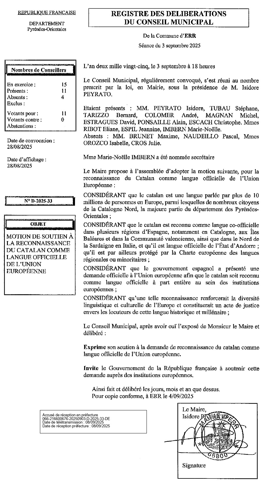 Le 3 septembre 2025, le conseil municipal d'Er (Alta Cerdanya) a approuvé la motion de soutien au catalan comme langue officielle de l’Union européenne. Une prise de position forte en faveur de la diversité linguistique.