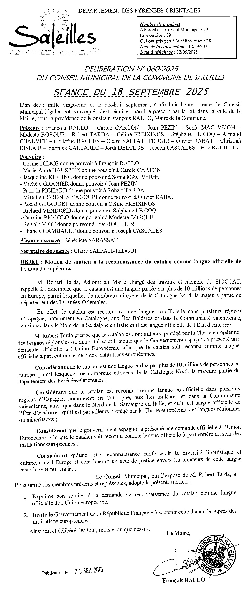 Le 18 septembre 2025, le conseil municipal de Salelles (Rosselló) en français, a approuvé la motion de soutien au catalan comme langue officielle de l’Union européenne. Une prise de position forte en faveur de la diversité linguistique.
