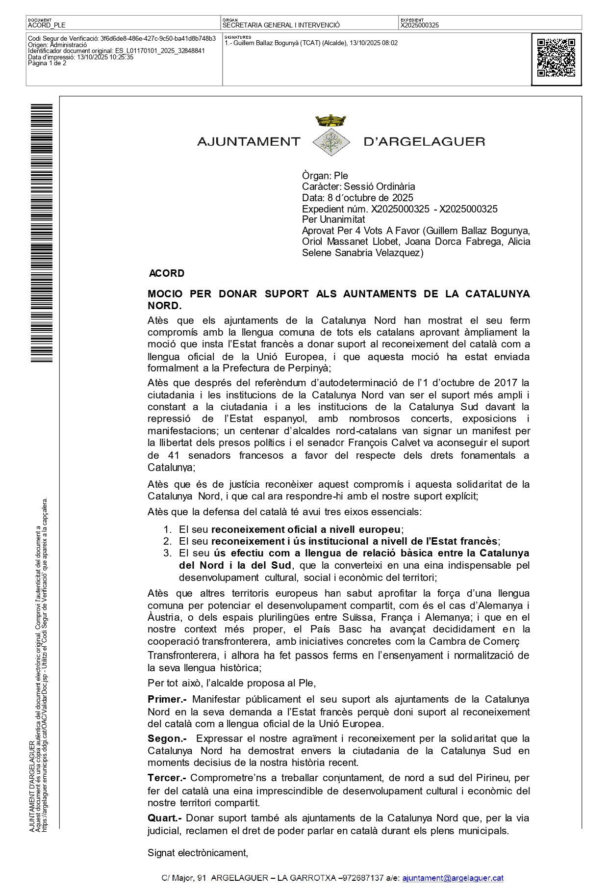 • Soutien aux municipalités de Catalogne Nord dans leur demande à l’État français afin qu’il appuie la reconnaissance du catalan comme langue officielle de l’Union européenne.