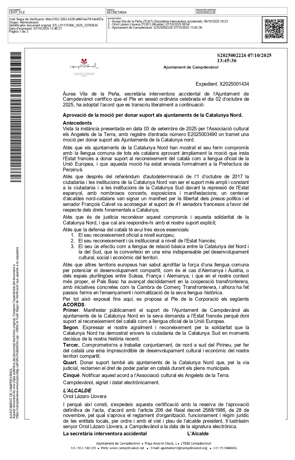 À la fin du mois d’août 2025, les Angelets de la Terra ont proposé aux municipalités de Catalogne Sud d’adhérer à une motion qui donne continuité et résonance à celle déjà impulsée avec les communes de Catalogne Nord. L’objectif est de partager la lutte pour la langue commune et de renforcer les liens entre les municipalités catalanes, au-delà des frontières étatiques.