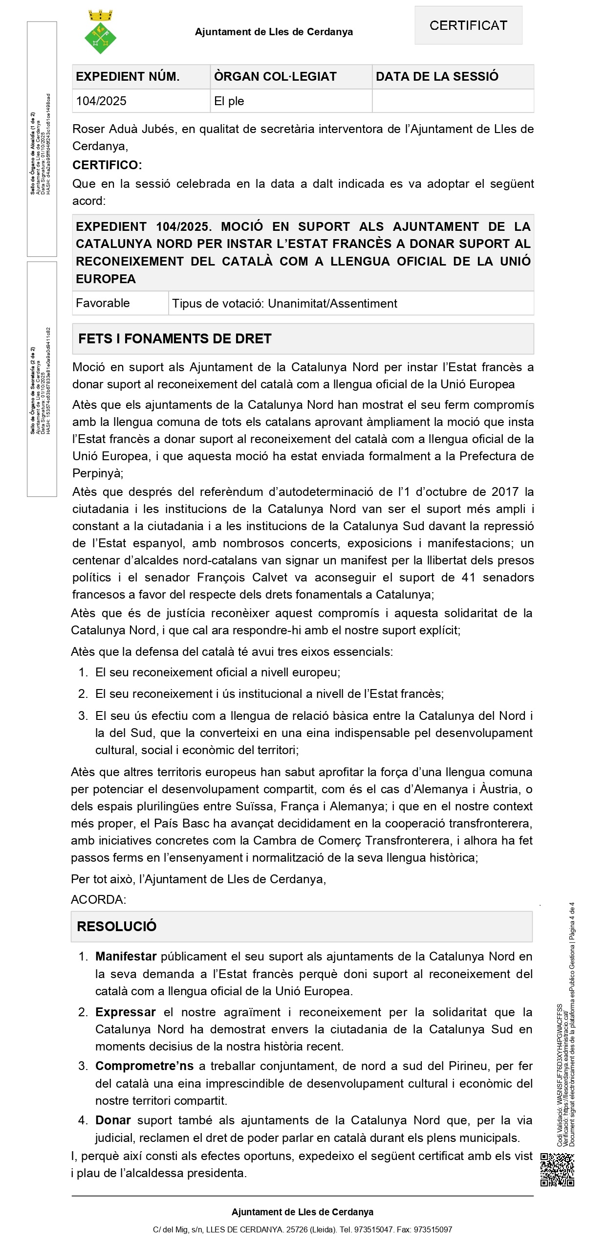 Lles de Cerdanya affirme son engagement pour la langue catalane et les liens avec la Catalogne Nord en approuvant la motion des Angelets de la Terra