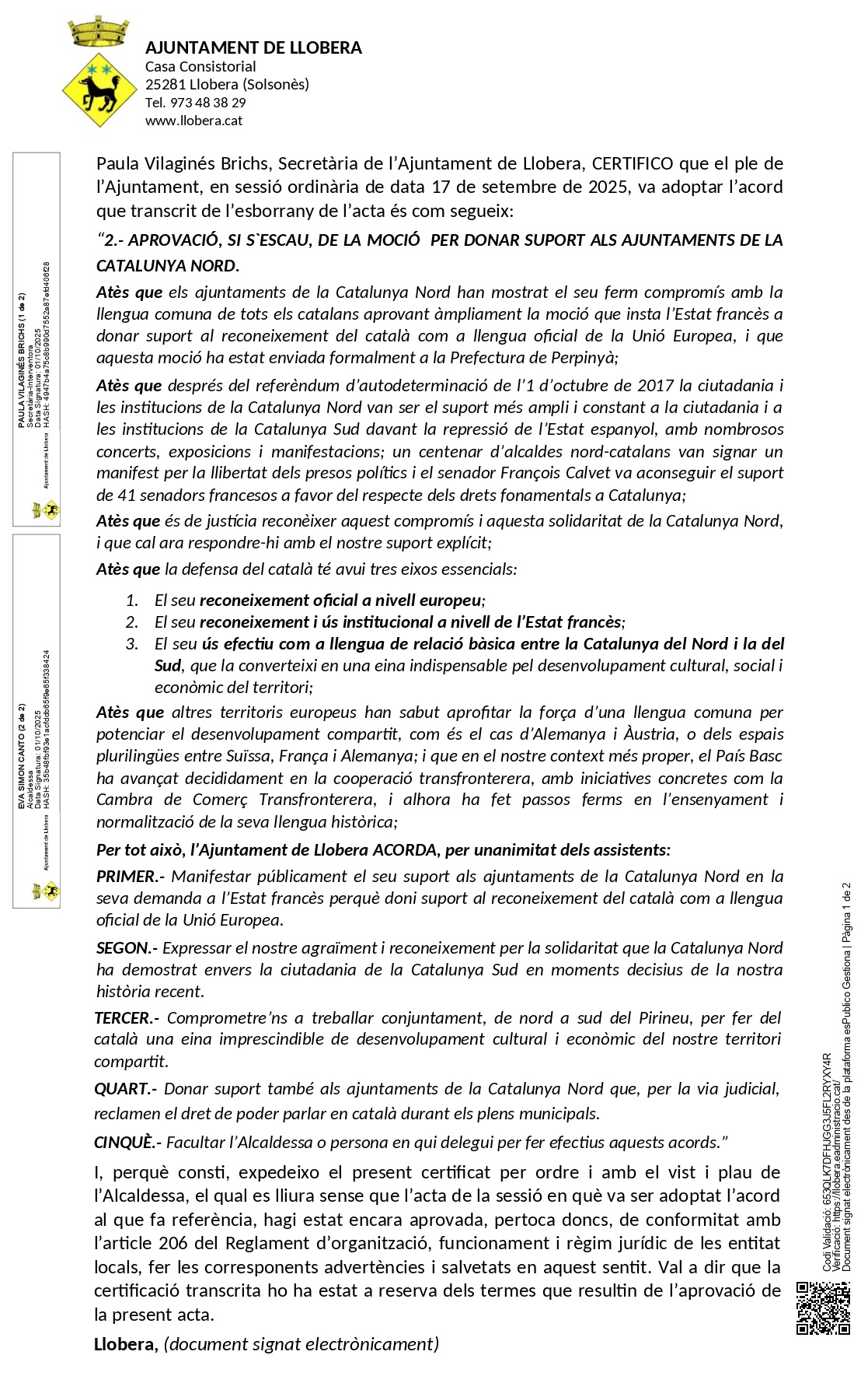 Avec cette adhésion, Llobera rejoint le réseau des communes qui soutiennent la langue catalane commune et la coopération entre la Catalogne Nord et la Catalogne Sud.