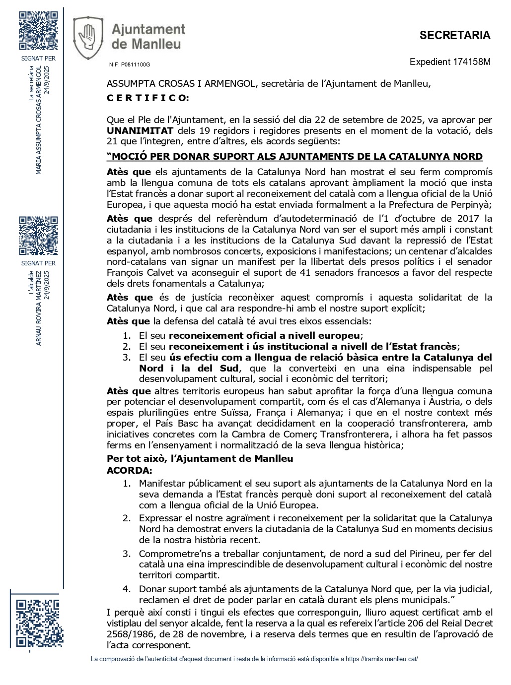 Cette motion exprime, depuis le sud, le soutien aux Catalans du Nord dans leur appel au gouvernement français pour défendre la reconnaissance officielle du catalan en Europe. Elle rend également hommage à la solidarité manifestée par la Catalogne Nord envers la population du sud lors de la répression de l’État espagnol après le référendum du 1er octobre 2017.