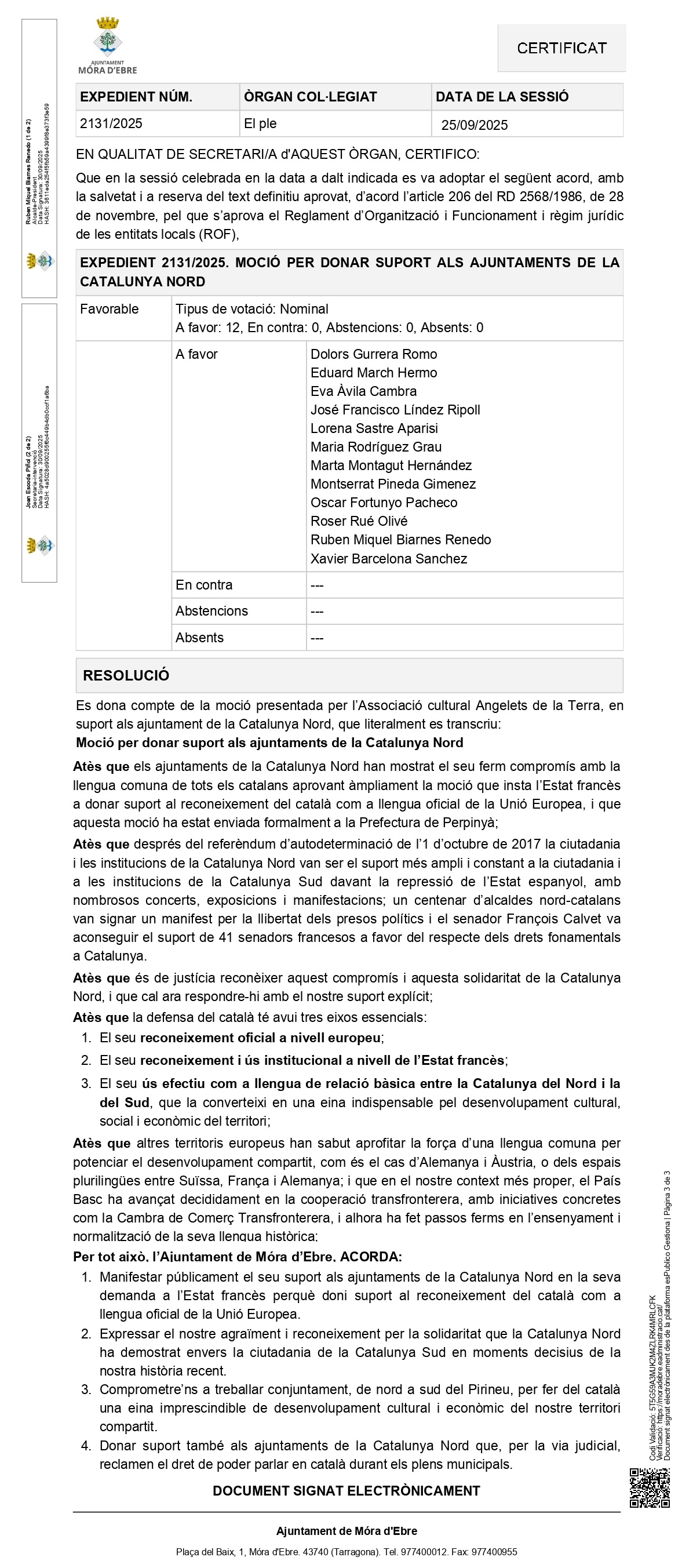 Móra d’Ebre approuve la motion des Angelets de la Terra en faveur de la langue catalane et des liens avec la Catalogne Nord