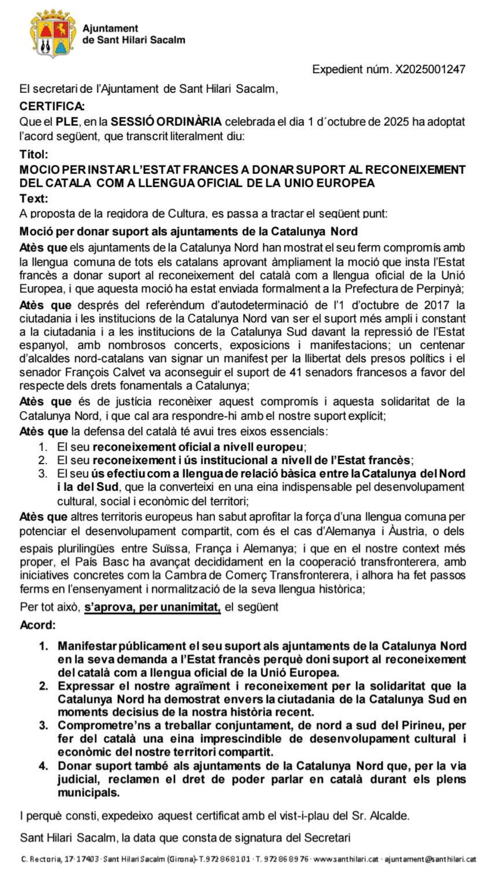 Le 1er octobre 2025, Sant Hilari Sacalm a approuvé la motion proposée par les Angelets de la Terra, en faveur de la langue catalane commune et du renforcement des liens entre la Catalogne Nord et la Catalogne Sud.