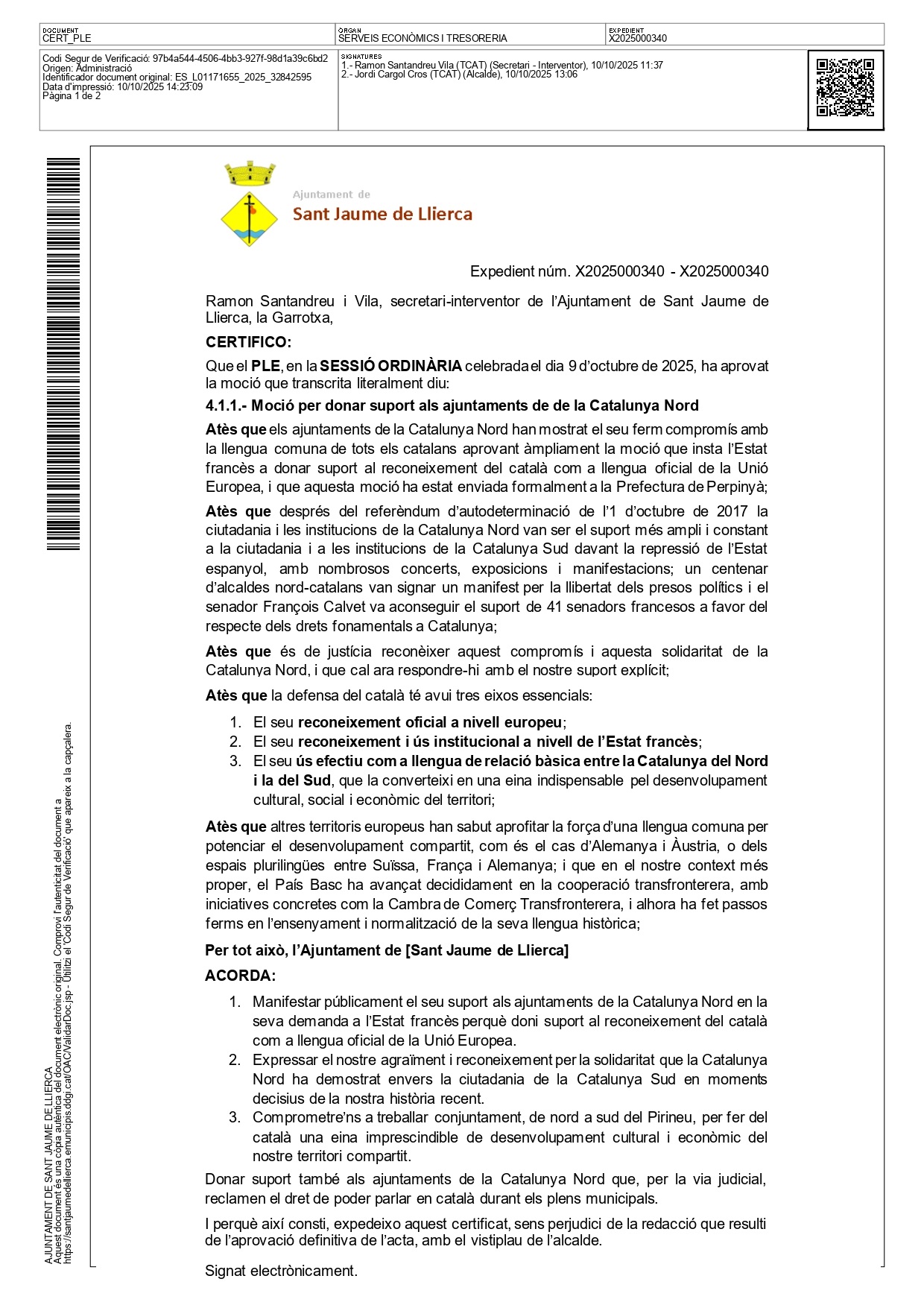 Sant Jaume de Llierca approuve la motion des Angelets de la Terra en faveur de la langue catalane et des liens avec la Catalogne Nord