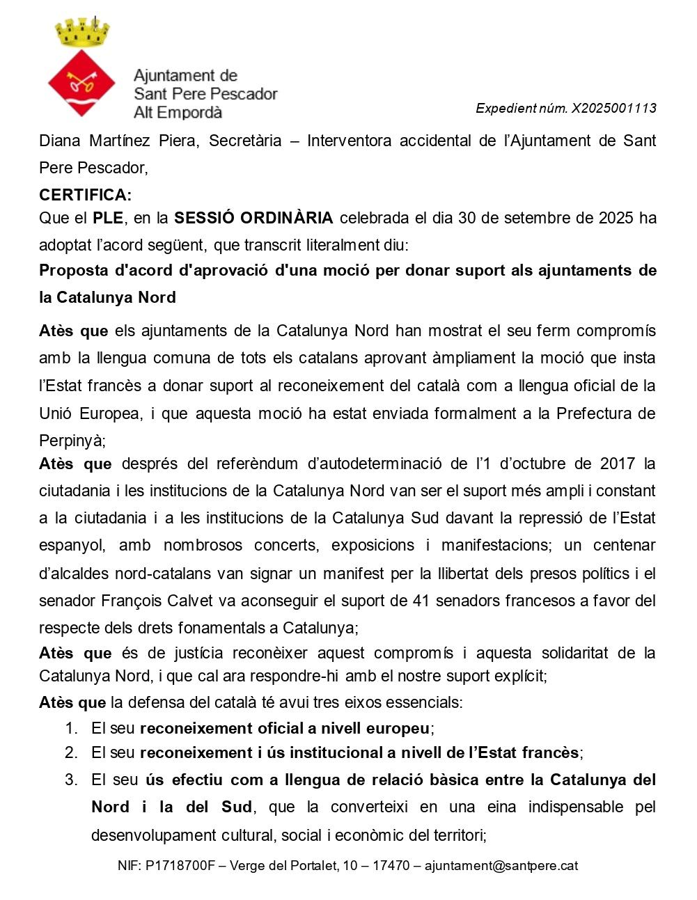 Le 30 septembre 2025, Sant Pere Pescador a approuvé la motion proposée par les Angelets de la Terra, en faveur de la langue catalane commune et du renforcement des liens entre la Catalogne Nord et la Catalogne Sud.