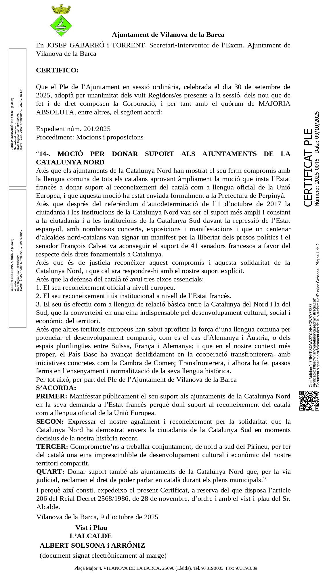 Le 30 septembre 2025, Vilanova de la Barca a approuvé la motion proposée par les Angelets de la Terra, en faveur de la langue catalane commune et du renforcement des liens entre la Catalogne Nord et la Catalogne Sud.