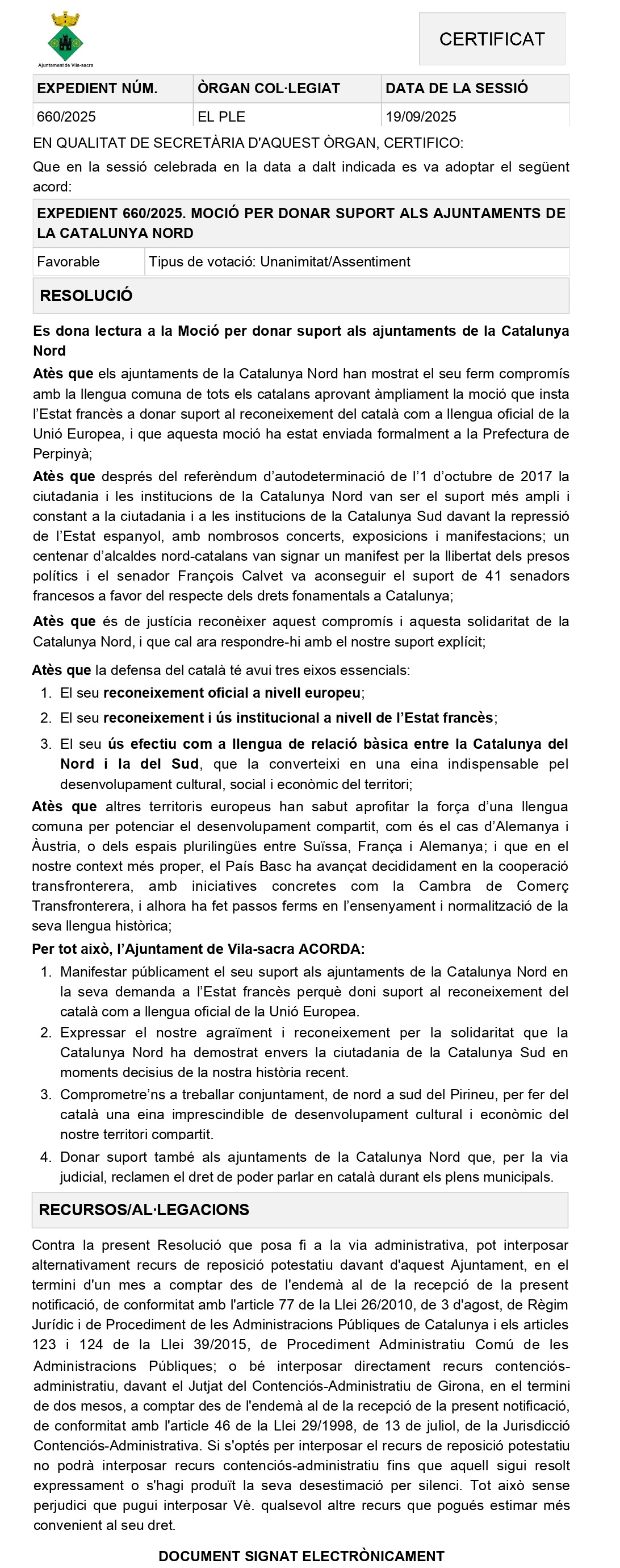 Avec cette adhésion, Vila-sacra rejoint le réseau des communes qui soutiennent la langue catalane commune et la coopération entre la Catalogne Nord et la Catalogne Sud.