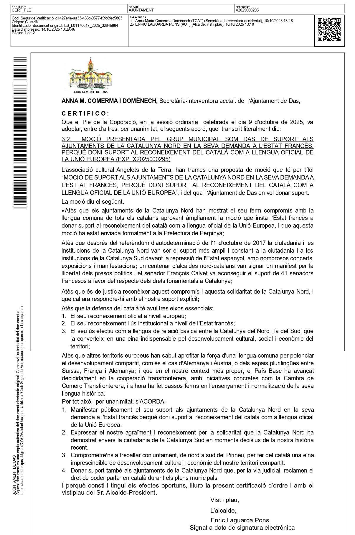 Le 9 octobre 2025, l’ajuntament de Das a approuvé la motion proposée par les Angelets de la Terra, en faveur de la langue catalane commune et du renforcement des liens entre la Catalogne Nord et la Catalogne Sud.