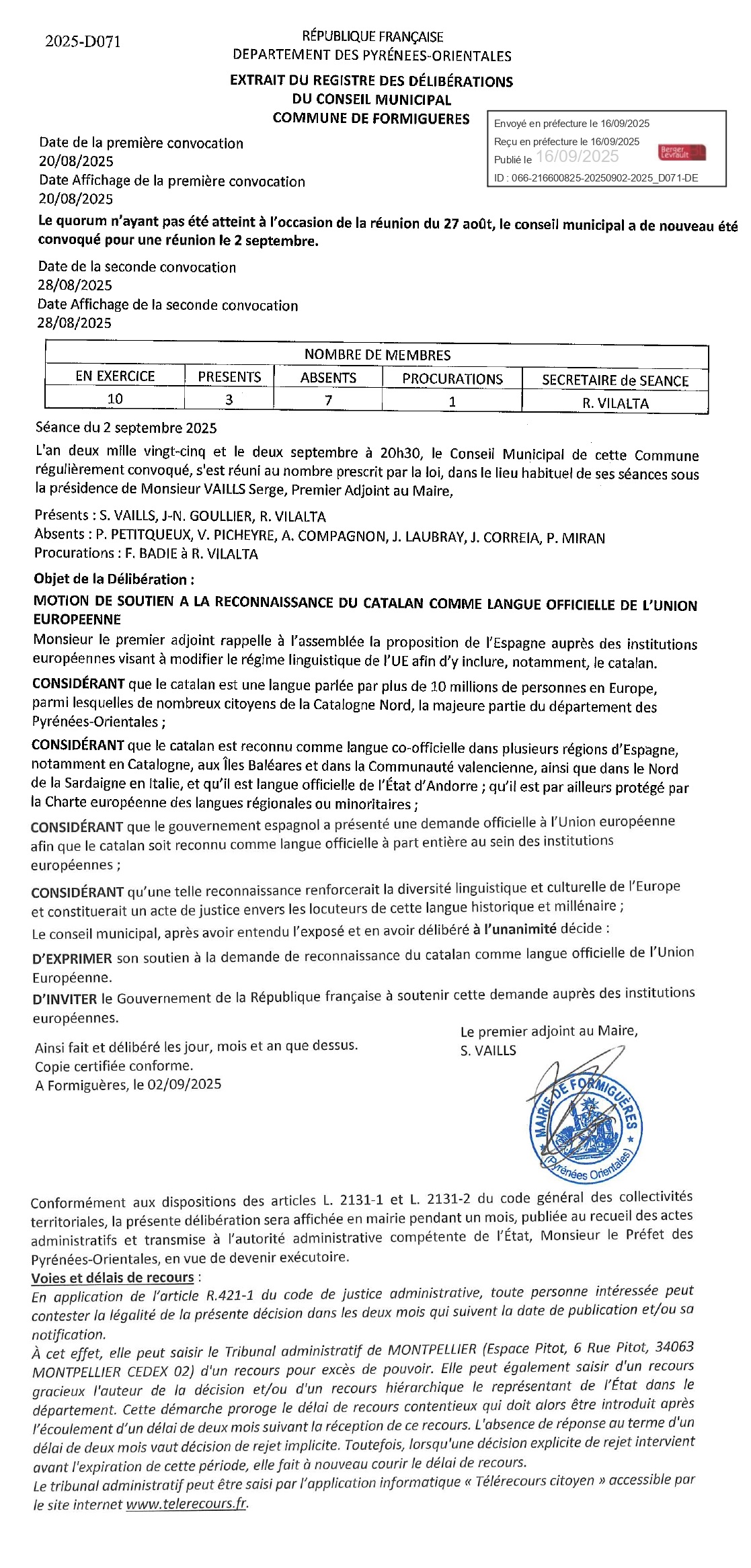 Le 28 août 2025, le conseil municipal de Formiguères a approuvé à l’unanimité la motion de soutien au catalan comme langue officielle de l’Union européenne. Cette décision constitue une prise de position claire en faveur de la diversité linguistique et de la reconnaissance des langues régionales.