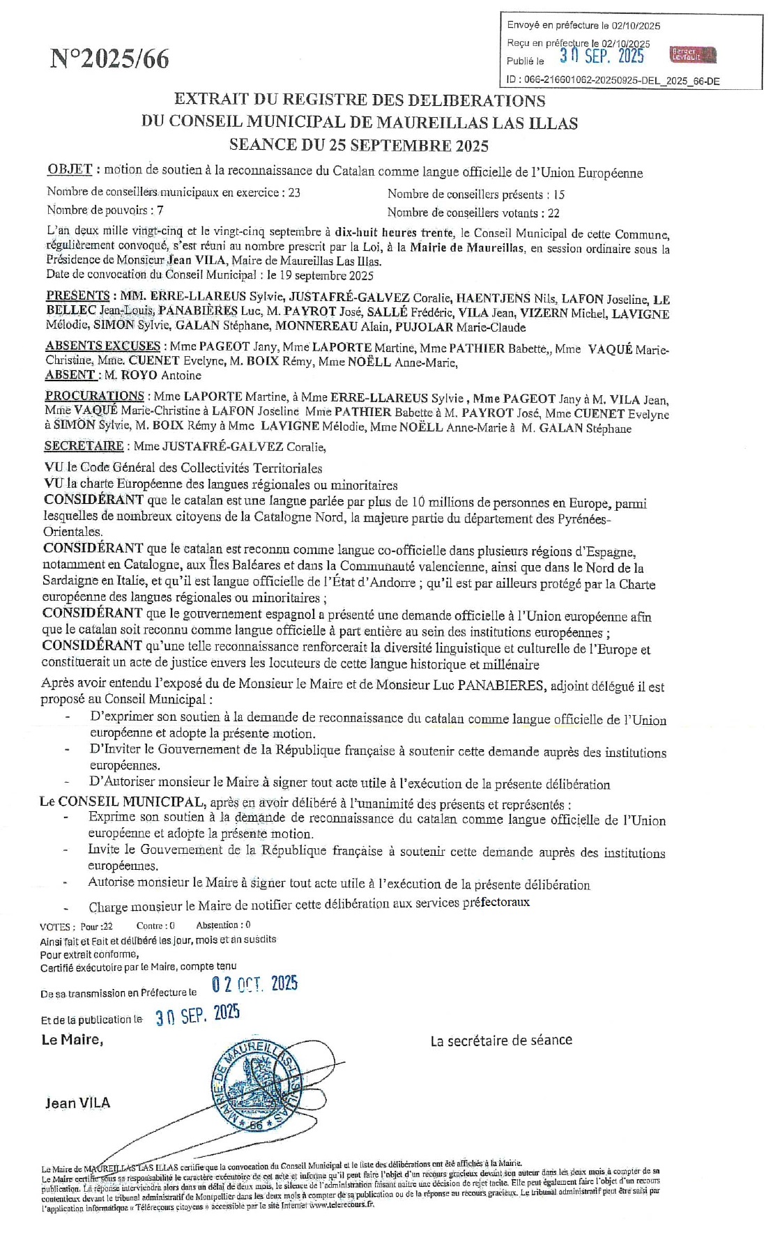 L’année 2025 marque un tournant important dans la défense institutionnelle du catalan en Catalogne Nord. Grâce à une campagne impulsée par les Angelets de la Terra, plusieurs communes nord-catalanes ont déjà adopté une motion de soutien à la reconnaissance du catalan comme langue officielle de l’Union européenne, et celles qui ne l’ont pas encore fait ont jusqu’en novembre pour s’y associer.
