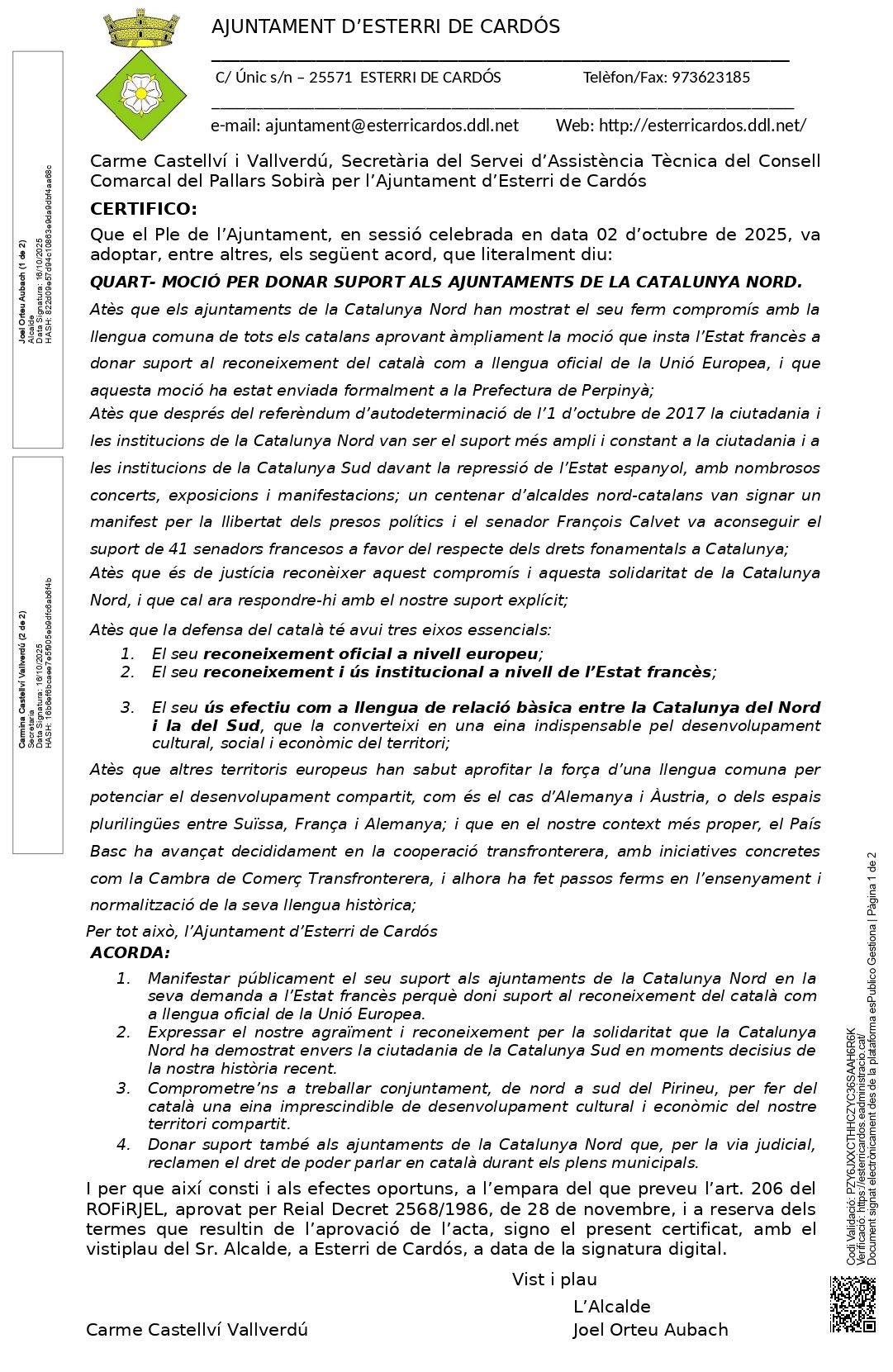 Le 2 octobre 2025, Esterri de Cardós a approuvé la motion proposée par les Angelets de la Terra, en faveur de la langue catalane commune et du renforcement des liens entre la Catalogne Nord et la Catalogne Sud.