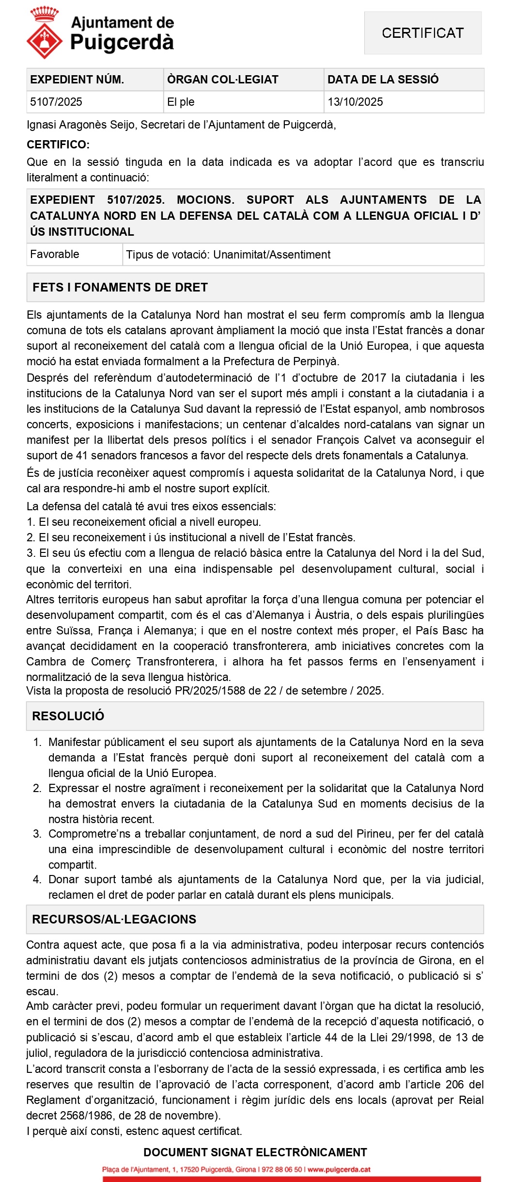 Puigcerdà approuve la motion des Angelets de la Terra pour affirmer sa solidarité et remercier les municipalités de Catalogne Nord