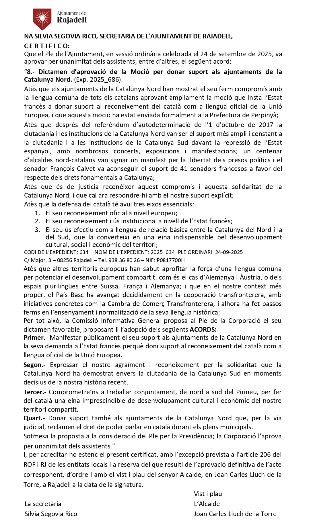 Rajadell approuve la motion des Angelets de la Terra pour affirmer sa solidarité et remercier les municipalités de Catalogne Nord