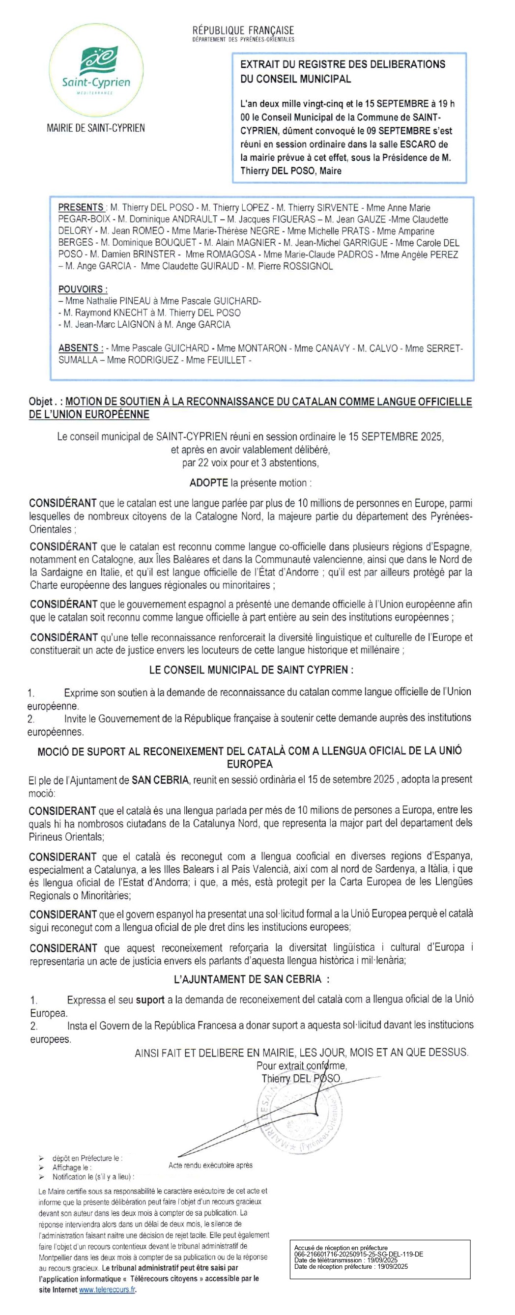 Le 15 septembre 2025, le conseil municipal de Sant Cebrià de Rosselló a adopté la motion de soutien au catalan comme langue officielle de l’Union européenne, proposée par l’association Angelets de la Terra. La motion a été transmise à la préfecture en deux versions, française et catalane.