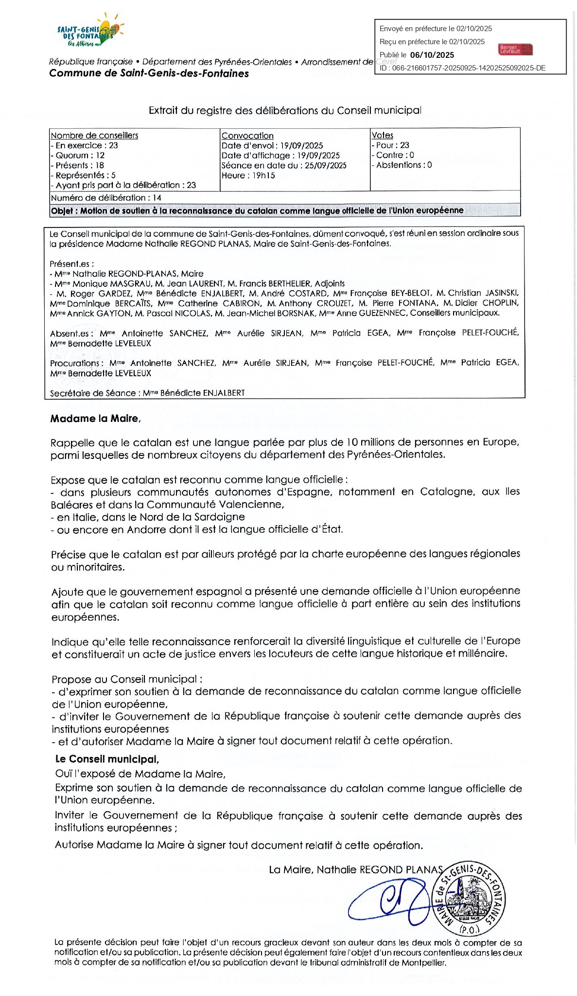 Le 19 septembre 2025, le conseil municipal de Sant Genis de Fontanes a approuvé à l’unanimité la motion de soutien au catalan comme langue officielle de l’Union européenne, proposée par l’association Angelets de la Terra.