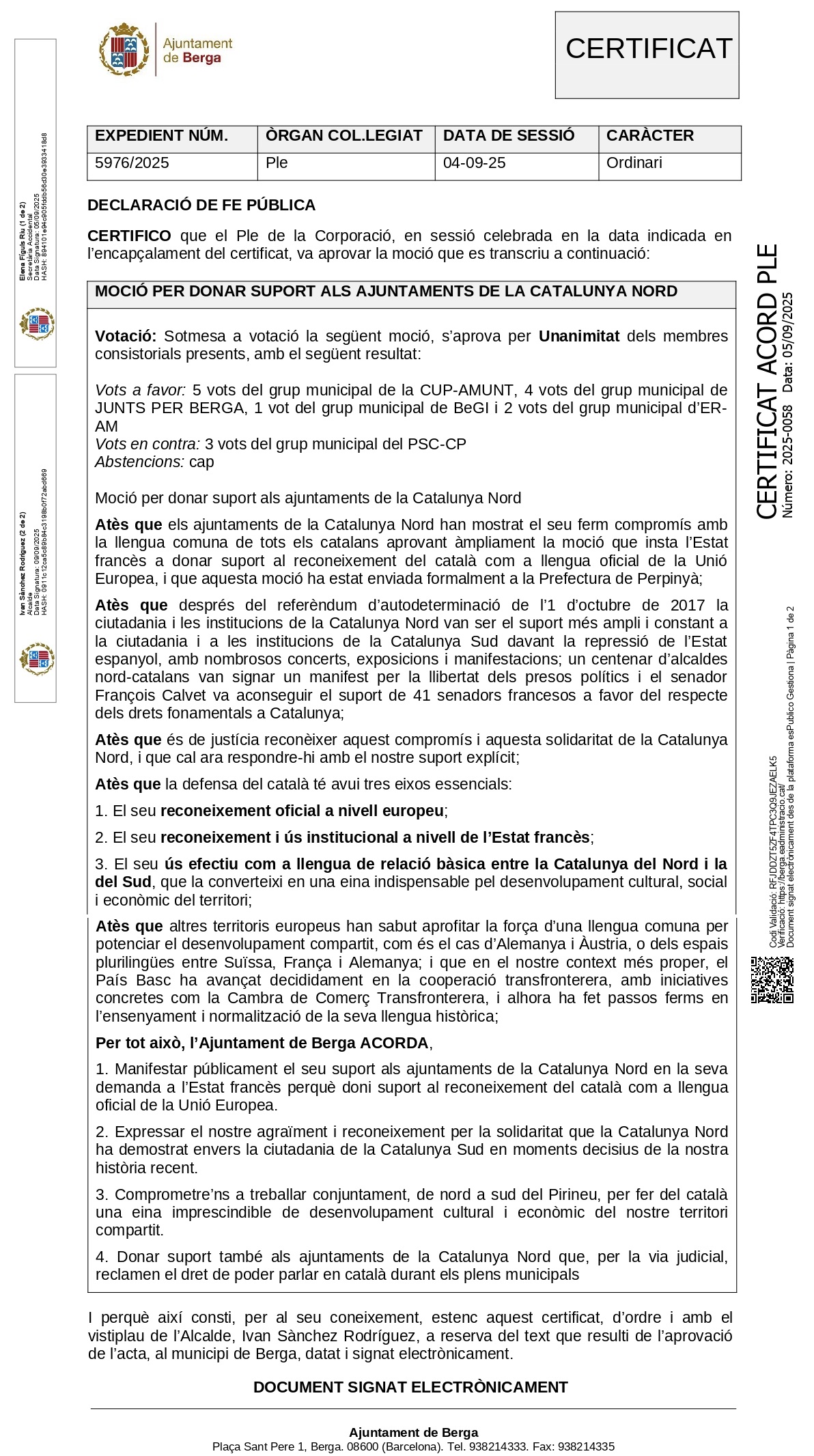 El 5 de setembre de 2025, Berga va aprovar la moció proposada pels Angelets de la Terra, en favor de la llengua catalana comuna i de l’enfortiment dels vincles entre la Catalunya Nord i la Catalunya Sud.