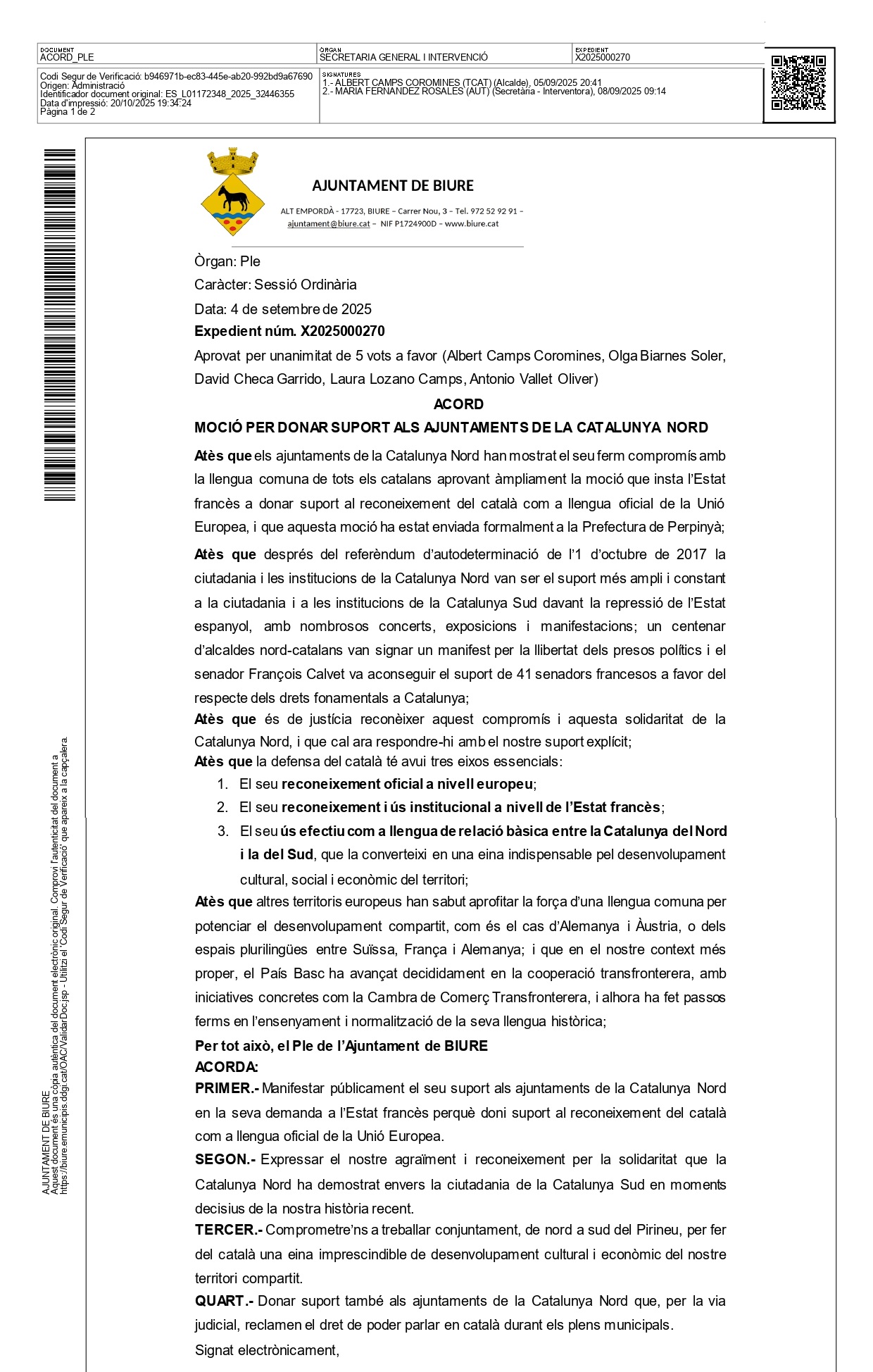 Avec cette adhésion, Biure rejoint le réseau des communes qui soutiennent la langue catalane commune et le renforcement des liens entre la Catalogne Nord et la Catalogne Sud.