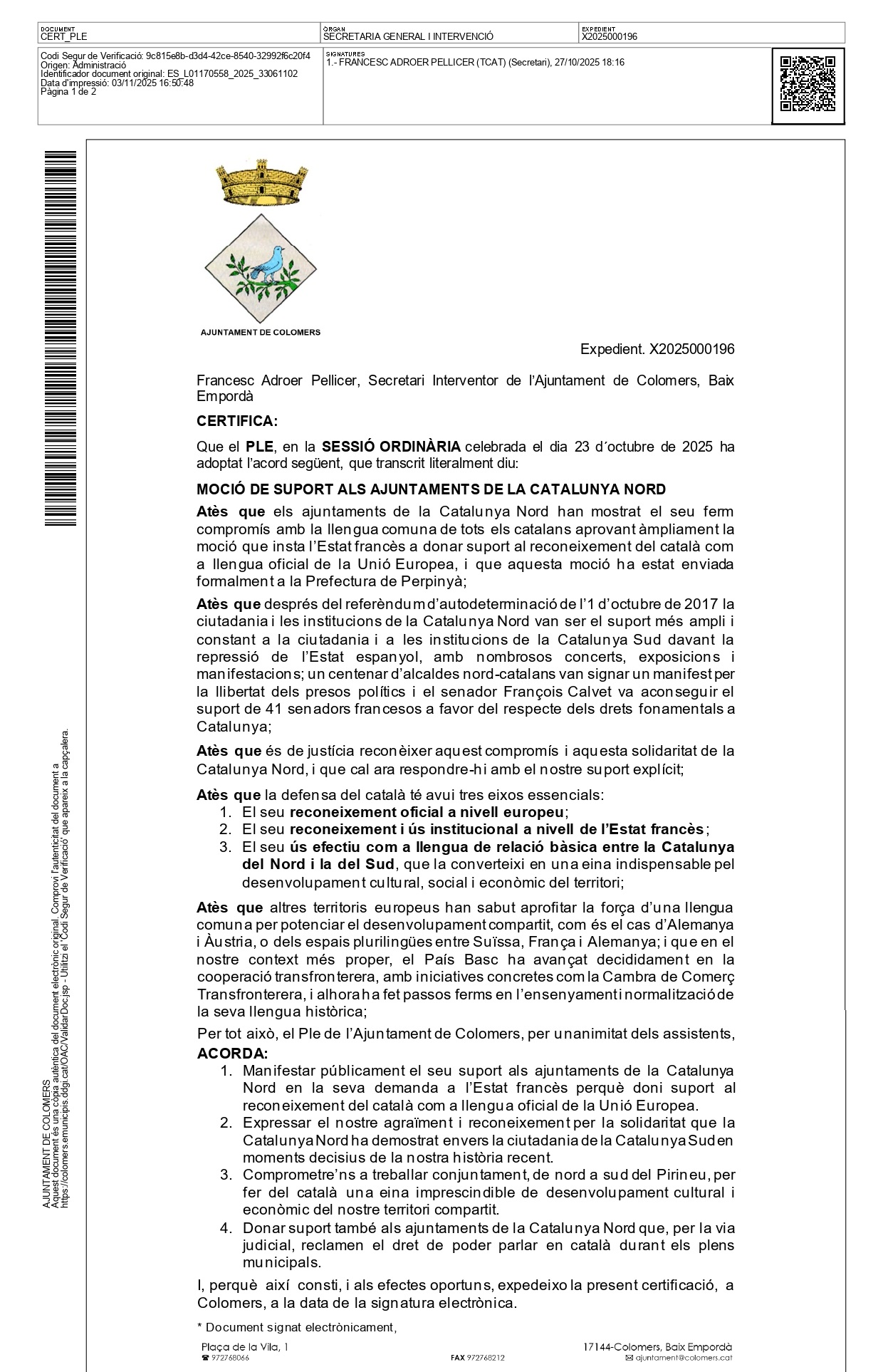 Avec cette adhésion, Colomers rejoint le réseau des communes qui soutiennent la langue catalane commune et le renforcement des liens entre la Catalogne Nord et la Catalogne Sud.