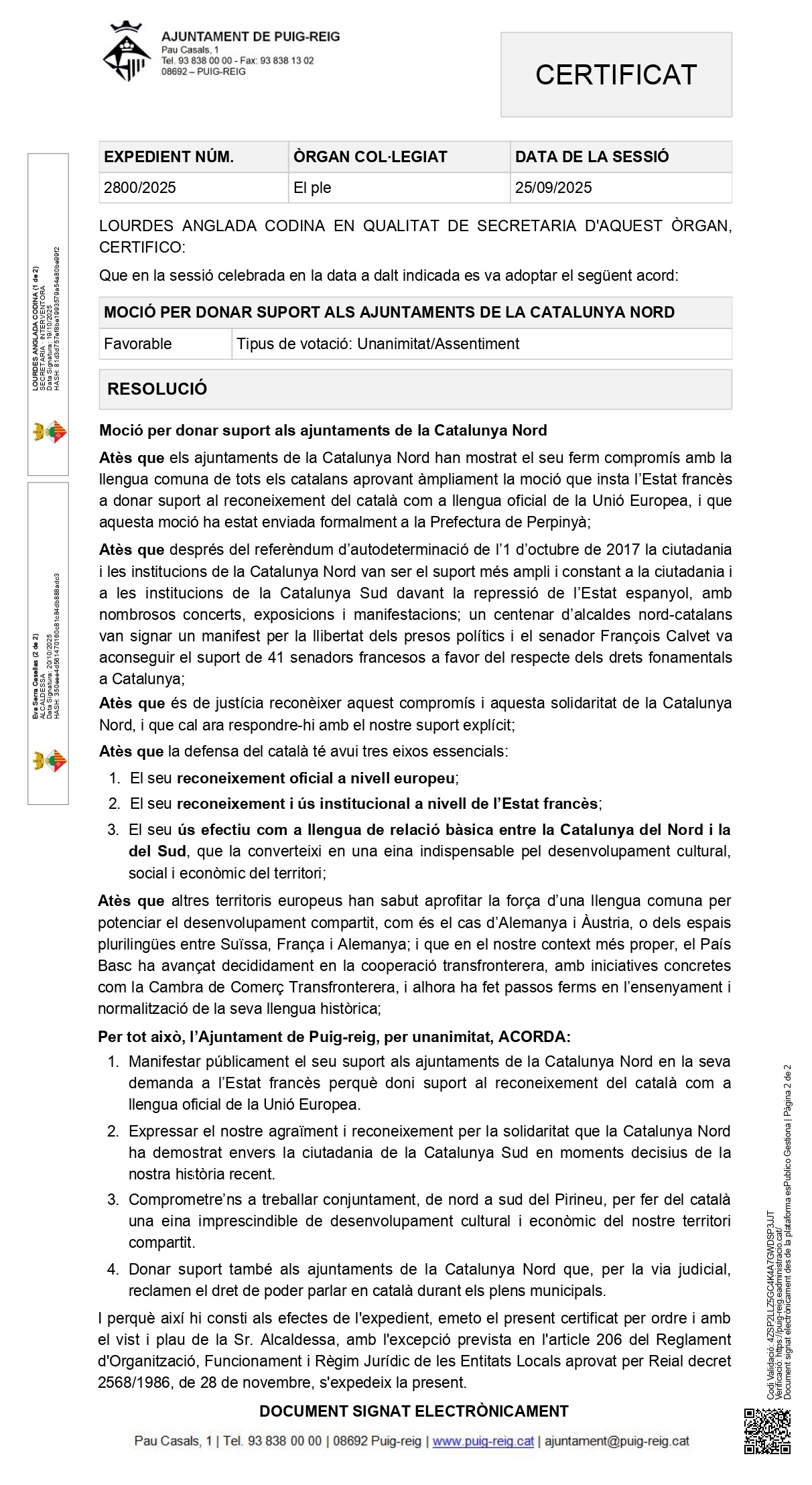 • Soutien aux municipalités de Catalogne Nord dans leur demande à l’État français afin qu’il facilite la reconnaissance du catalan comme langue officielle de l’Union européenne.