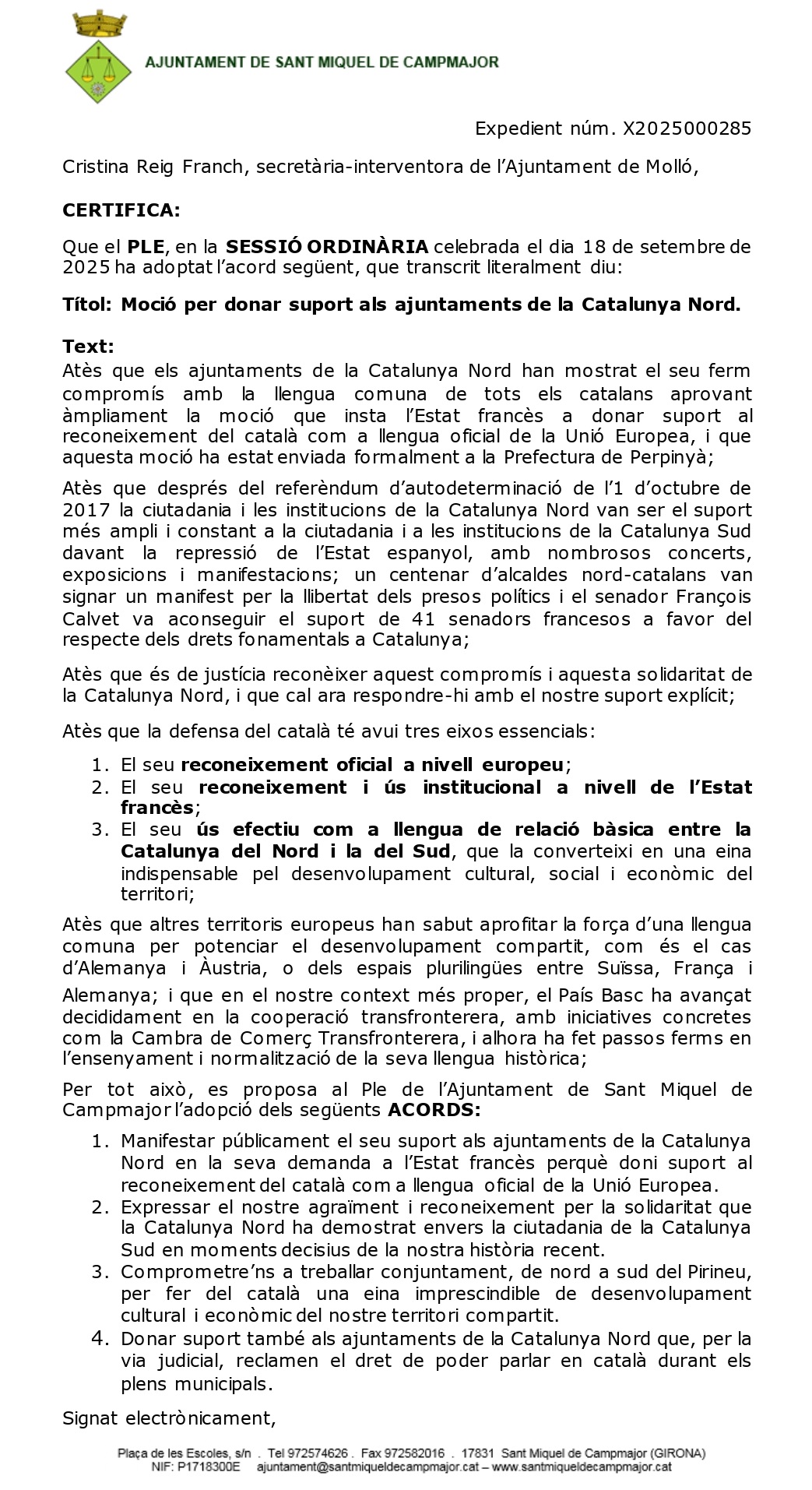 Avec cette adhésion, Sant Miquel de Campmajor rejoint les communes qui soutiennent la langue catalane commune et le renforcement des liens entre la Catalogne Nord et la Catalogne Sud.