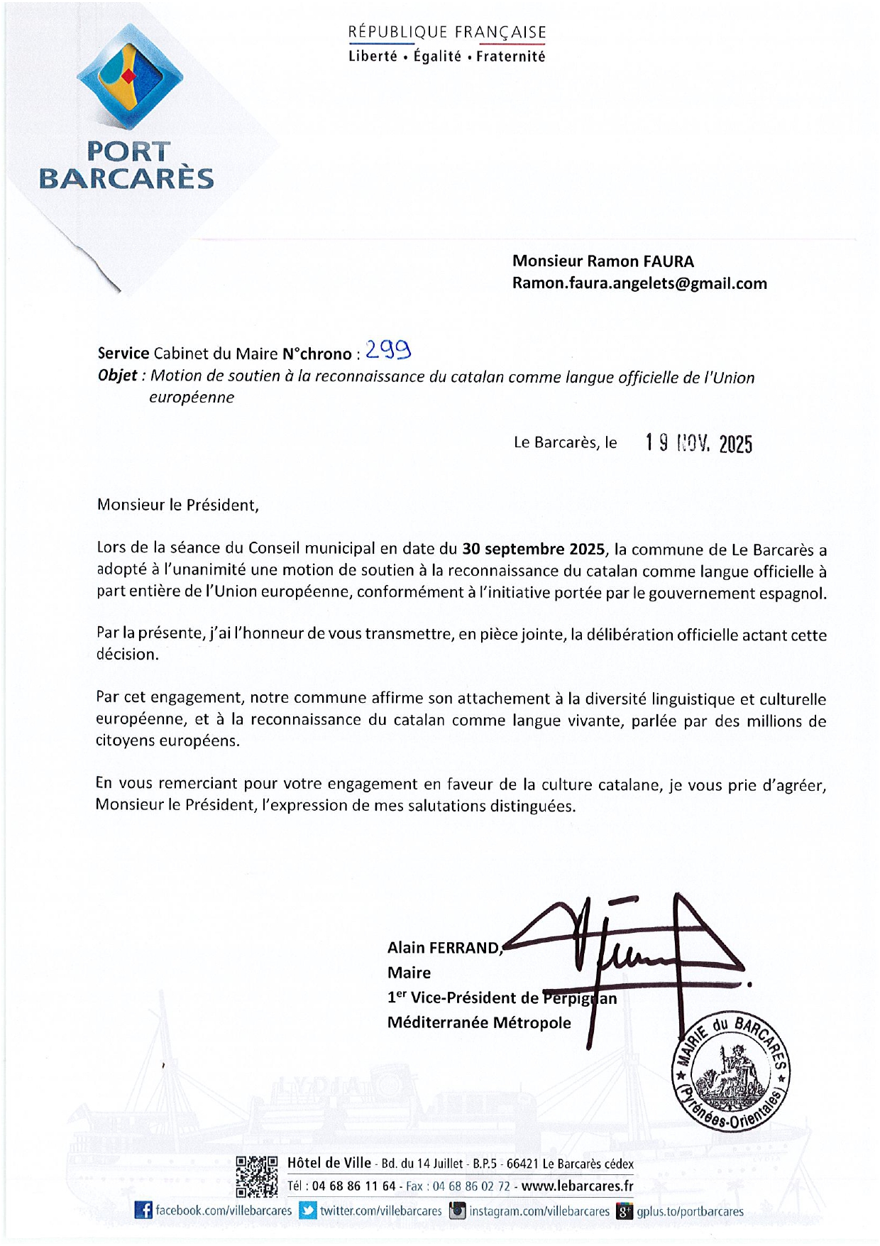 Le 30 septembre 2025, le conseil municipal du Barcarès (Catalogne Nord) a adopté à l'unanimité une motion soutenant la reconnaissance du catalan comme langue officielle de l’Union européenne. Cette décision marque un engagement clair en faveur de la diversité linguistique en France et en Europe.