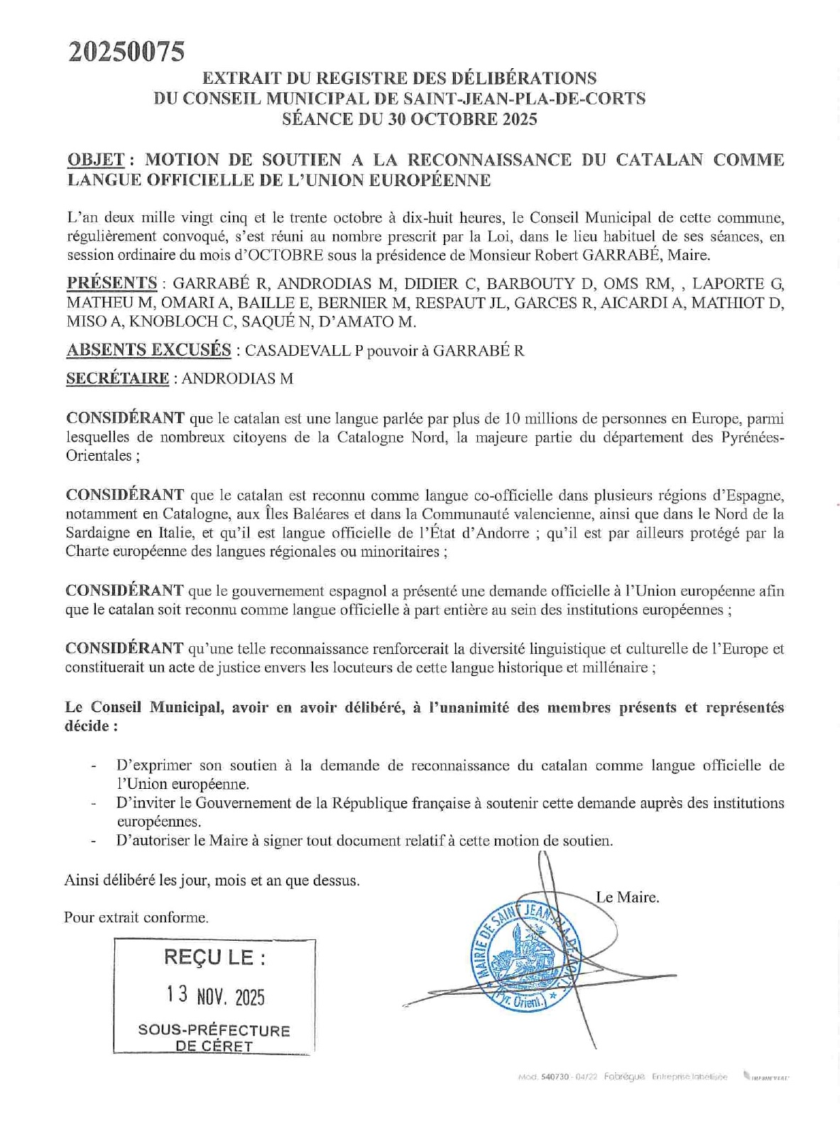 Le 30 octobre 2025, le conseil municipal de Sant Joan de Pladecorts (Vallespir) a adopté à l’unanimité une motion, transmise à la préfecture, en faveur de la reconnaissance du catalan comme langue officielle de l’Union européenne. Il s’agit d’une position claire en faveur de la diversité linguistique en France et en Europe.