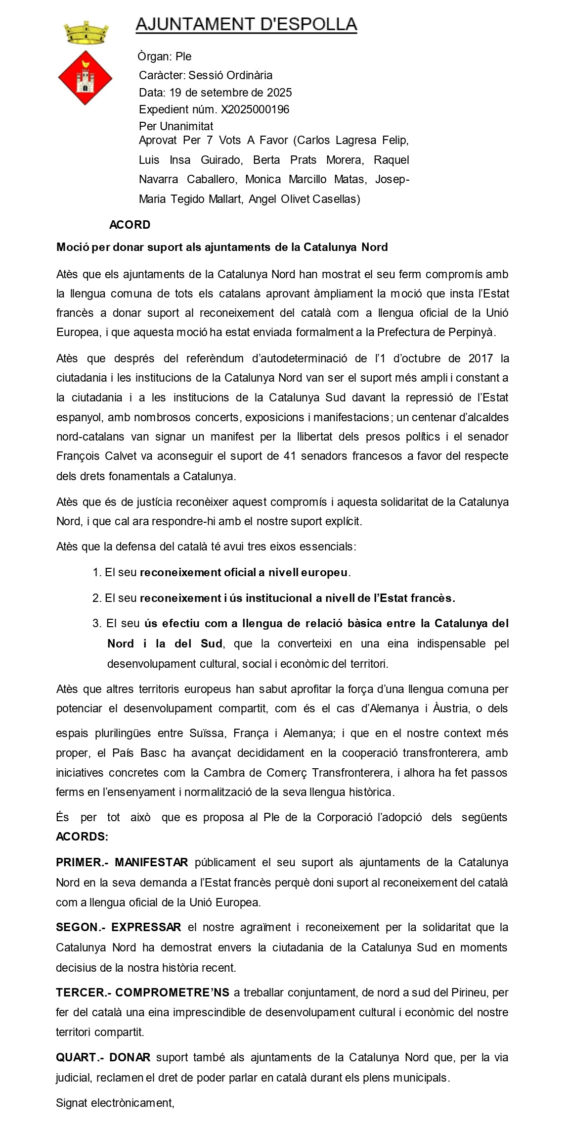 Le 19 septembre 2025, la municipalité d’Espolla a approuvé à l’unanimité la motion proposée par les Angelets de la Terra, visant à défendre la langue catalane commune et à renforcer les liens entre la Catalogne Nord et la Catalogne Sud.
